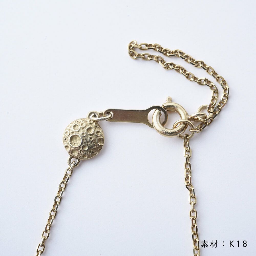 ネックレスのチェーンの留め具の部分は、さり気なく月のデザインになっています。トップスの首元の開き具合に合わせて長さを変えることができるアジャスター付き。