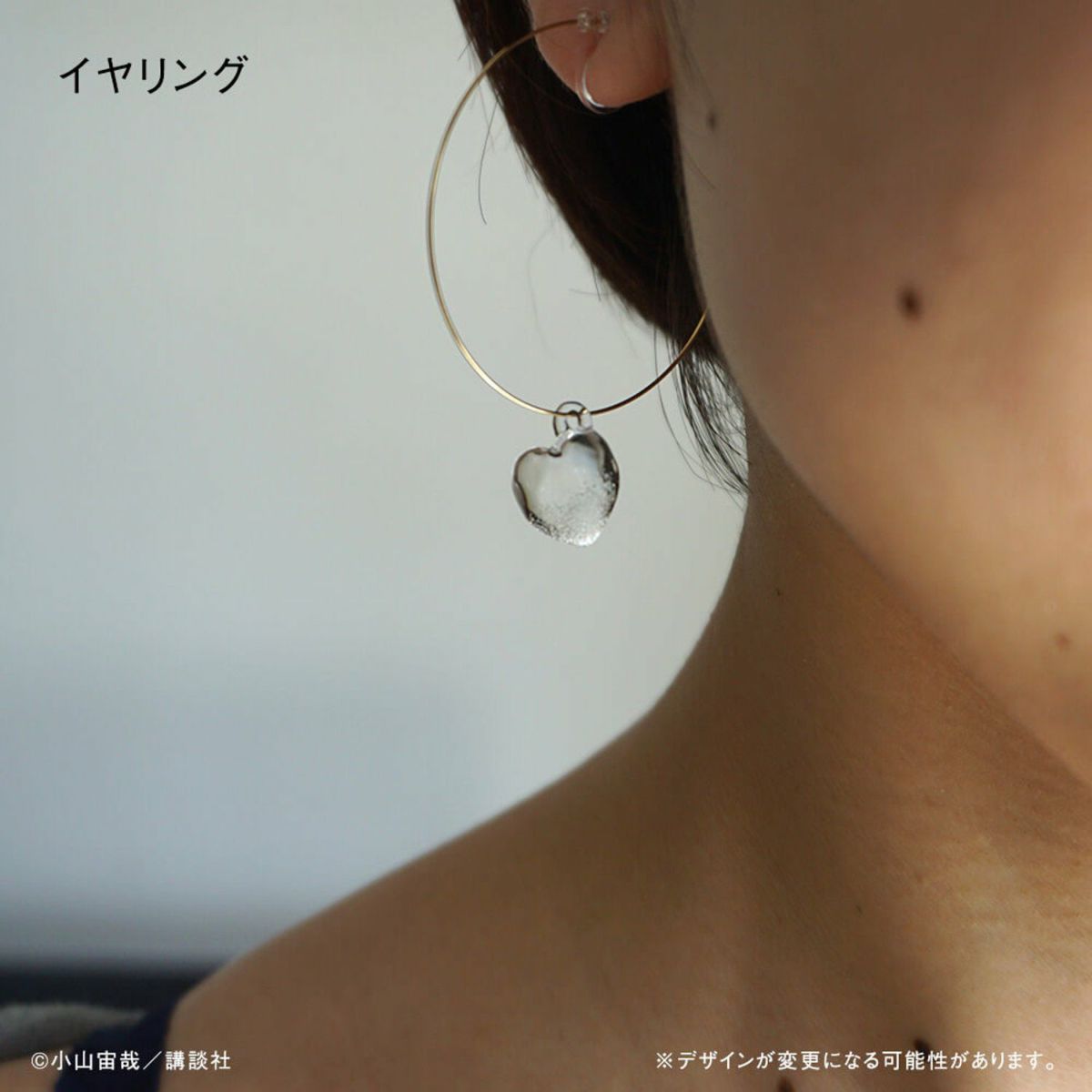 月の表面を覆うレゴリスの成分に含まれるガラス。今回のアクセサリーは、そんなガラスで作りました。宇宙兄弟公式アイテム初のピアス/イヤリング、そしてネックレスは、どちらも上品に輝くクリアな耐熱ガラス製。コロンとしたフォルムで月の石を表現しています。細めのフープやチェーンの先で揺れる透明感のある小ぶりなガラスが、耳元や首元で上品に輝きます。