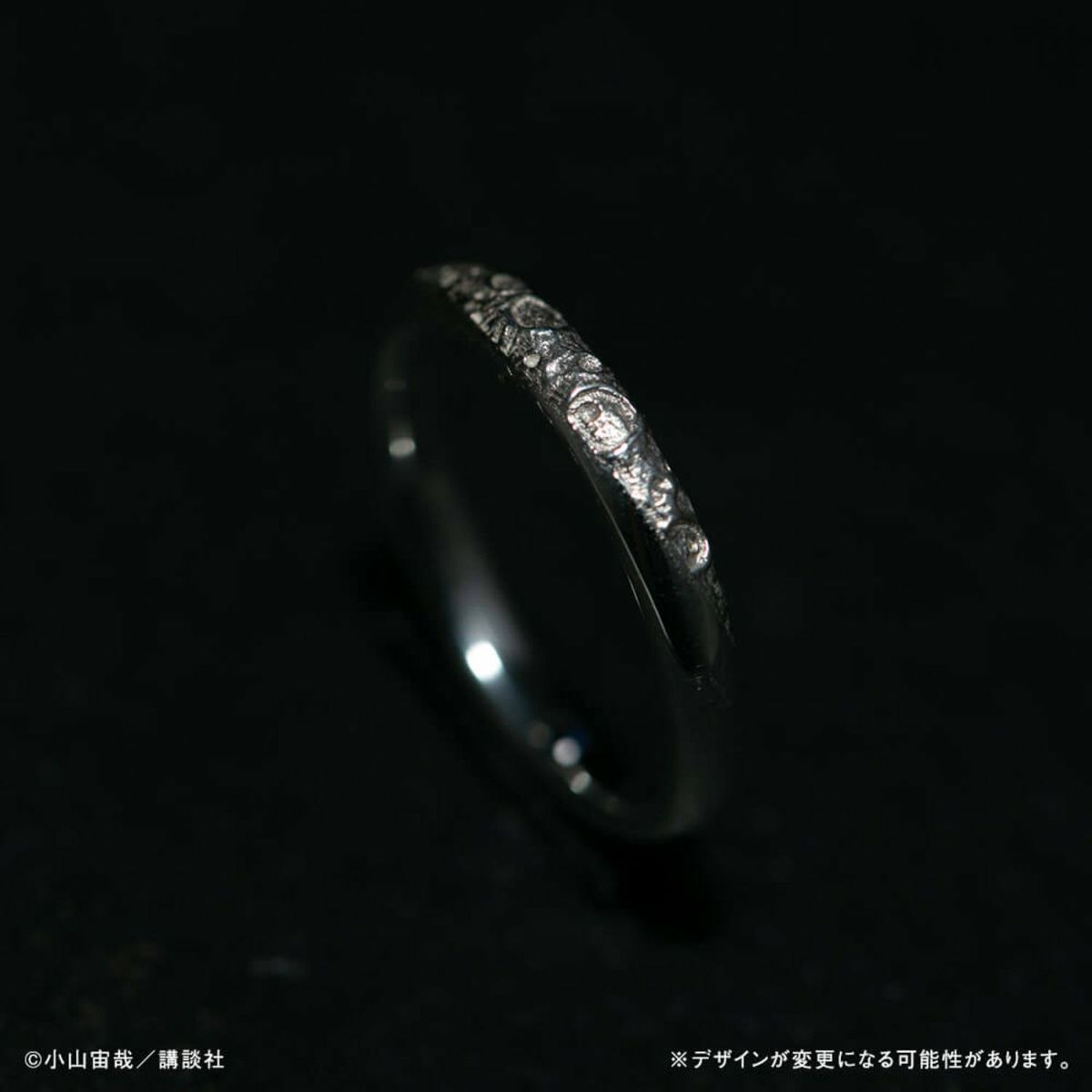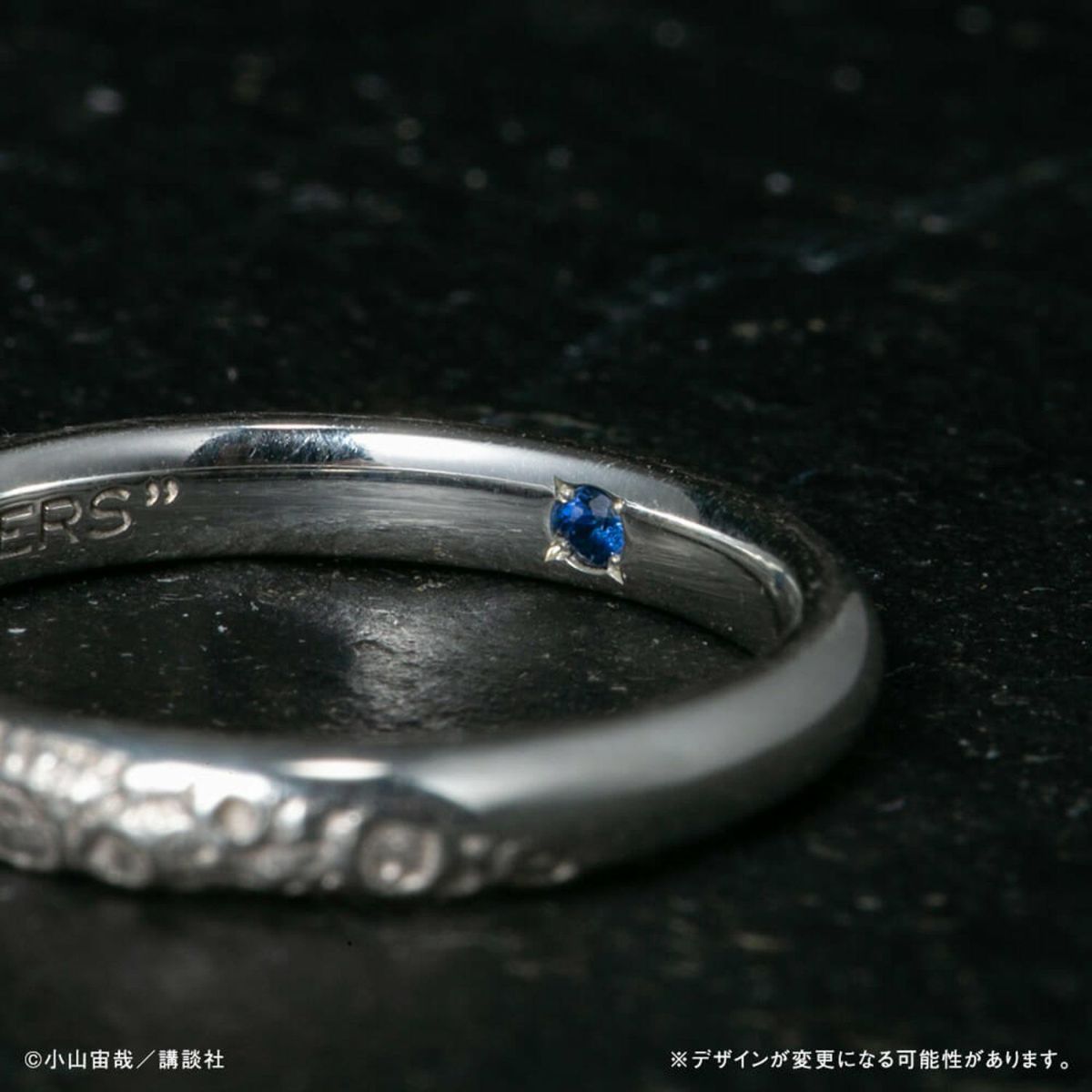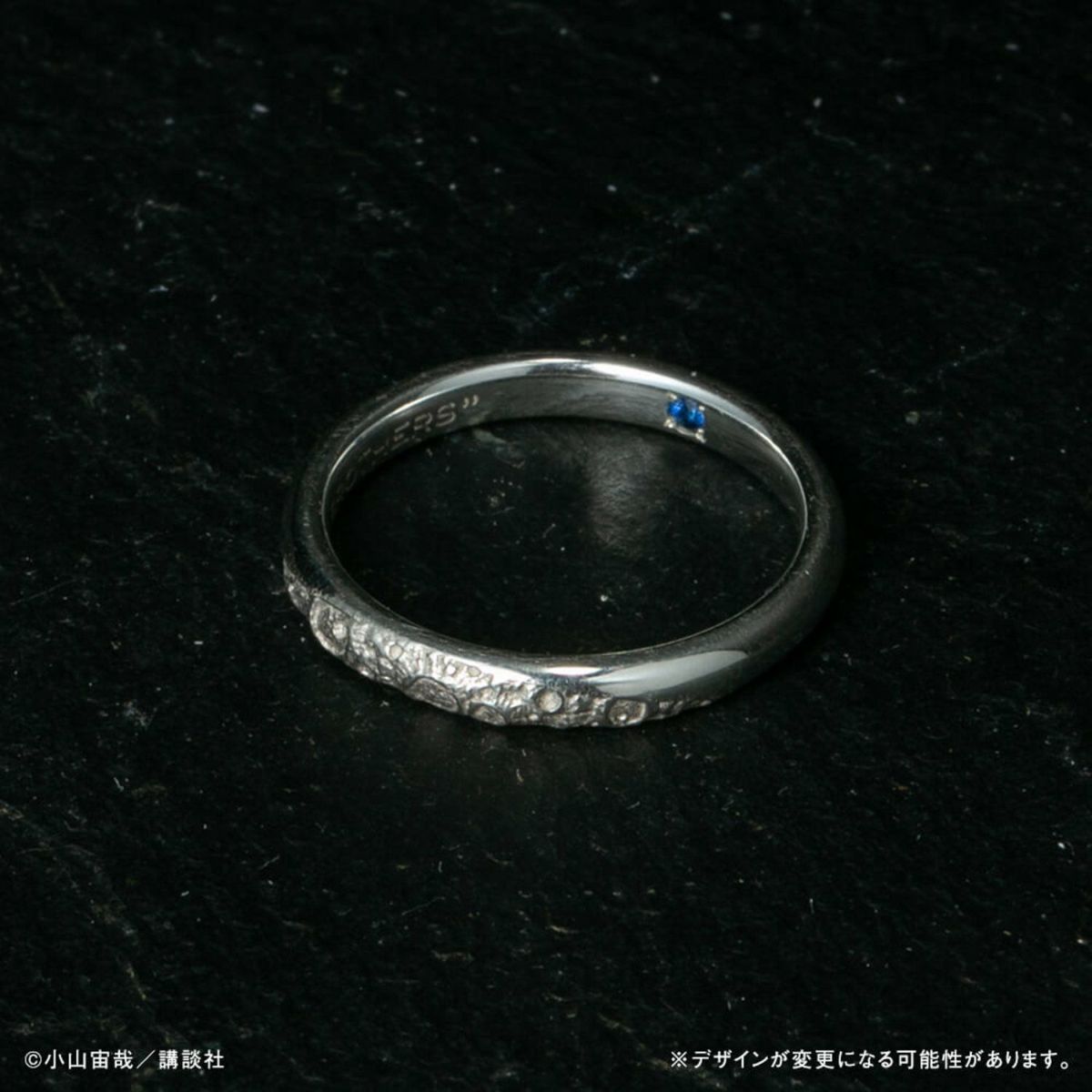 リングの表面には、月面のクレーターをデザイン。そして、内側には「地球」をイメージしたブルーサファイアをあしらいました。このリングを斜めから見ると、表面の月面越しに、ムッタやヒビトが月から見た地球を眺めることができるかのような作りです。