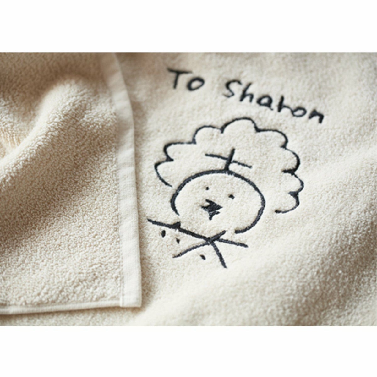 シャロンが膝にかけた時にいつも見える位置に、ムッタの可愛いサインが入っています。そのサインを刺繍で再現。