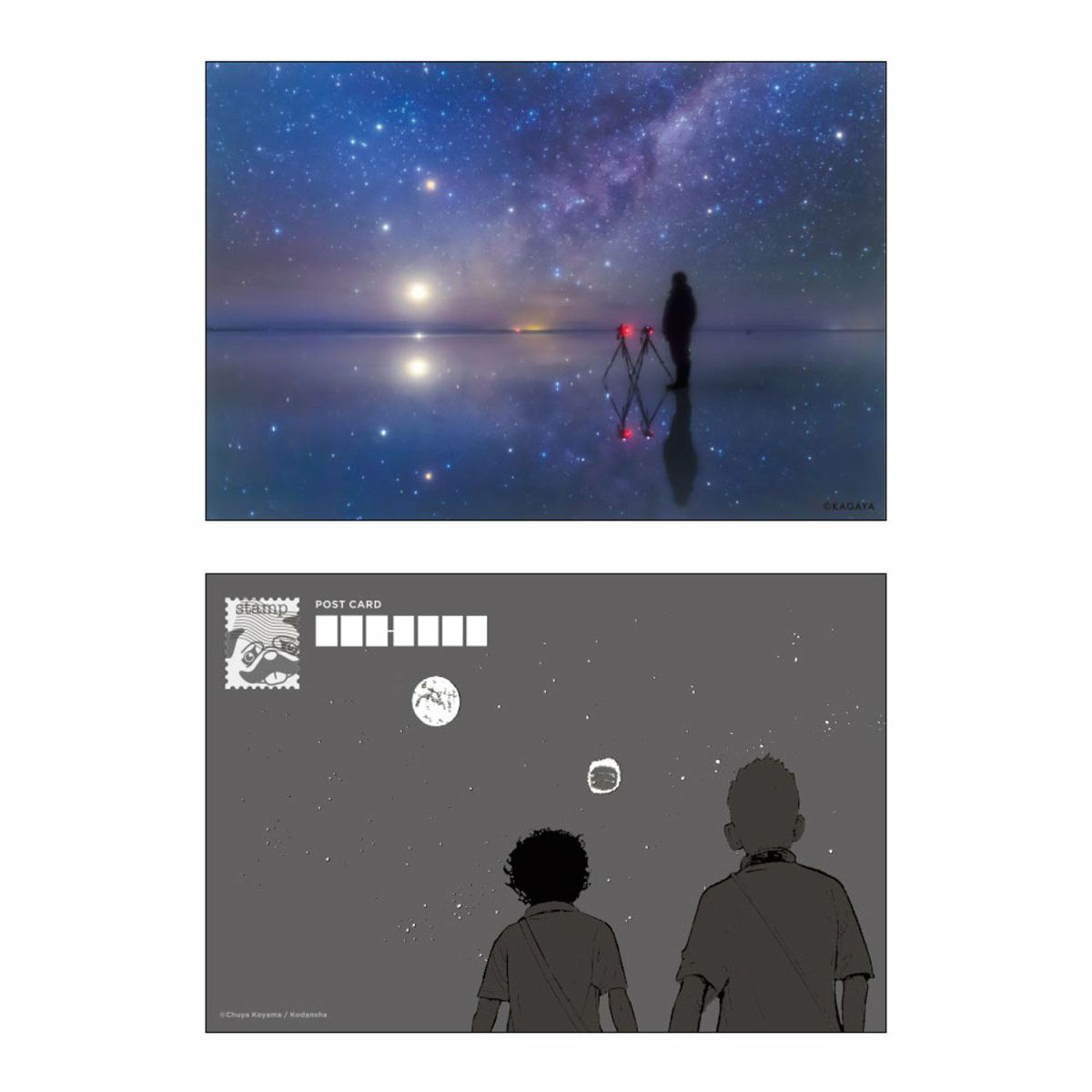 表は一瞬の宇宙表紙写真 ウユニ塩湖 裏の宛先欄には宇宙兄弟の夢のはじまりのイラストが印字されたポストカードです。