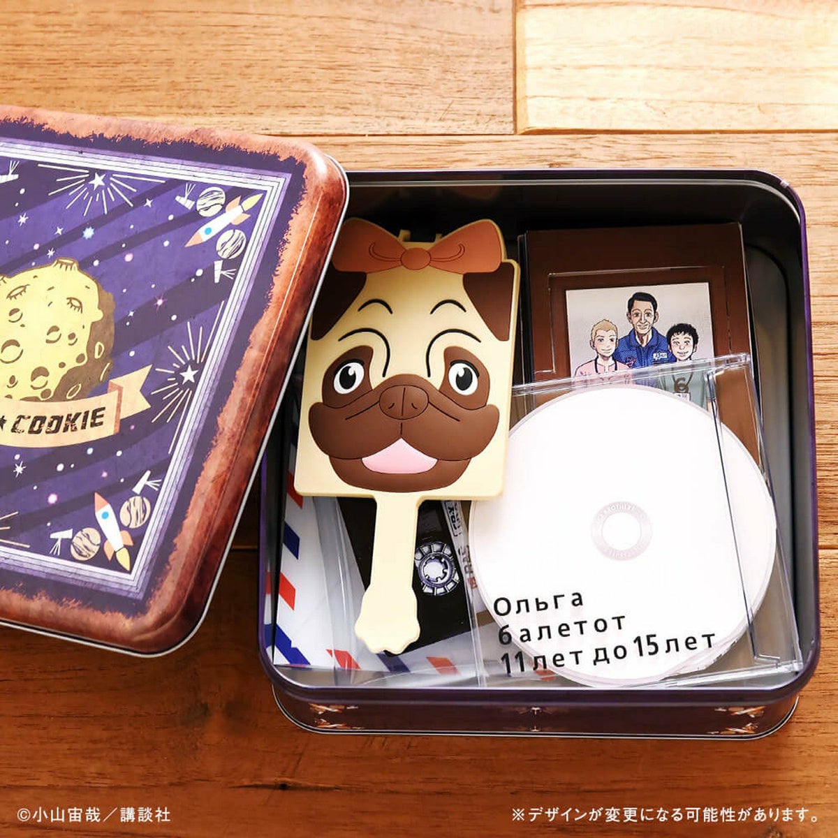 記念セットでは、このSPACE COOKIE缶を完全再現。缶の中身はステーショナリーセットにしました!P・Dミラー風のラゲッジタグ、オリガのDVD風ポストカードセット、毛利さんとのスリーショット風のブロックメモ帳、エアメール風クリアファイル、カセットテープ風のマルチケース。