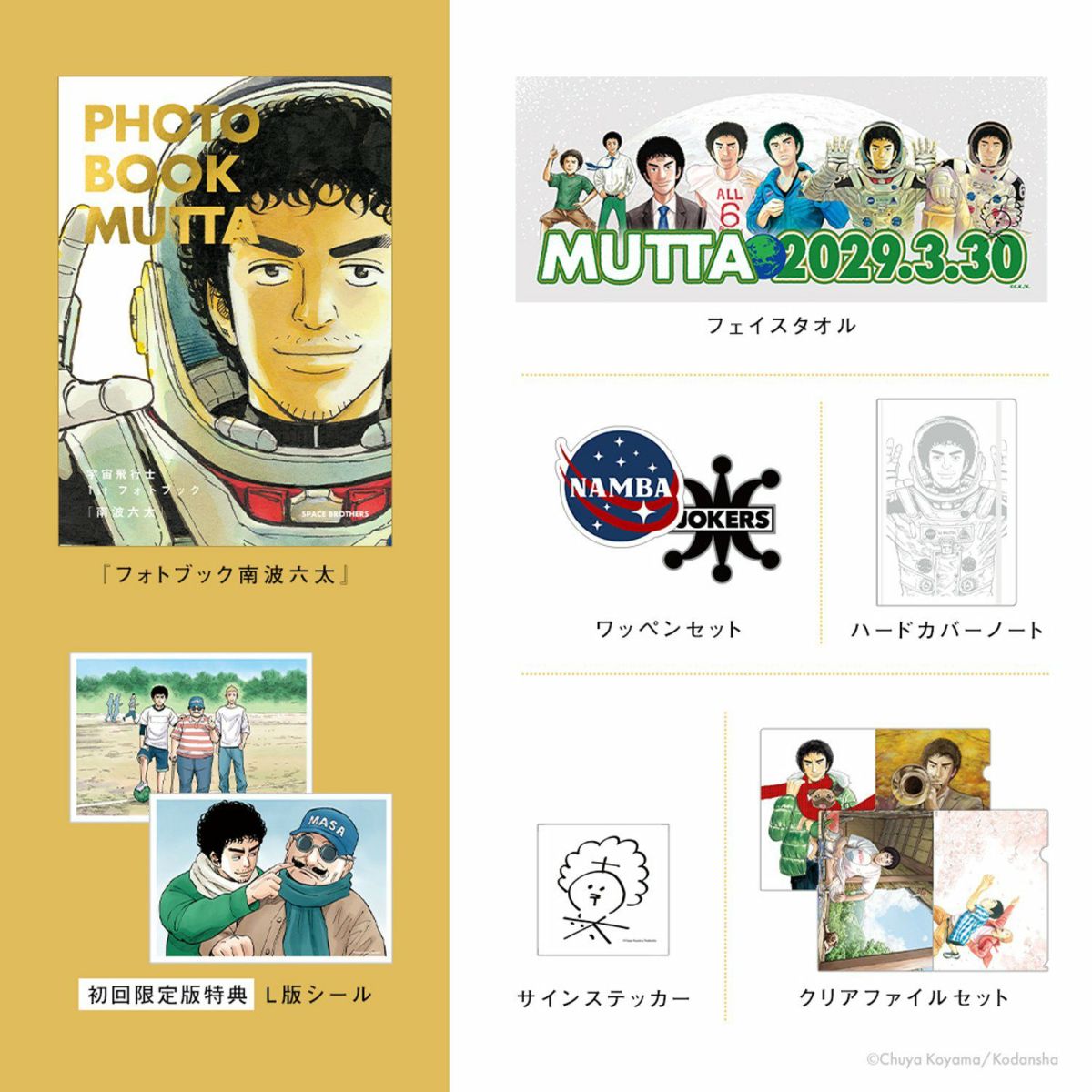 フォトブックの表紙を飾ったムッタのビジュアルのハードカバーノートや、ムッタの宇宙への打ち上げ日付入りのマフラータオル、ムッタが身につけているワッペンのレプリカなど、スペシャルな南波六太グッズが揃いました。フォトブックの巻頭を飾る春夏秋冬のムッタの写真が入ったクリアファイルも。