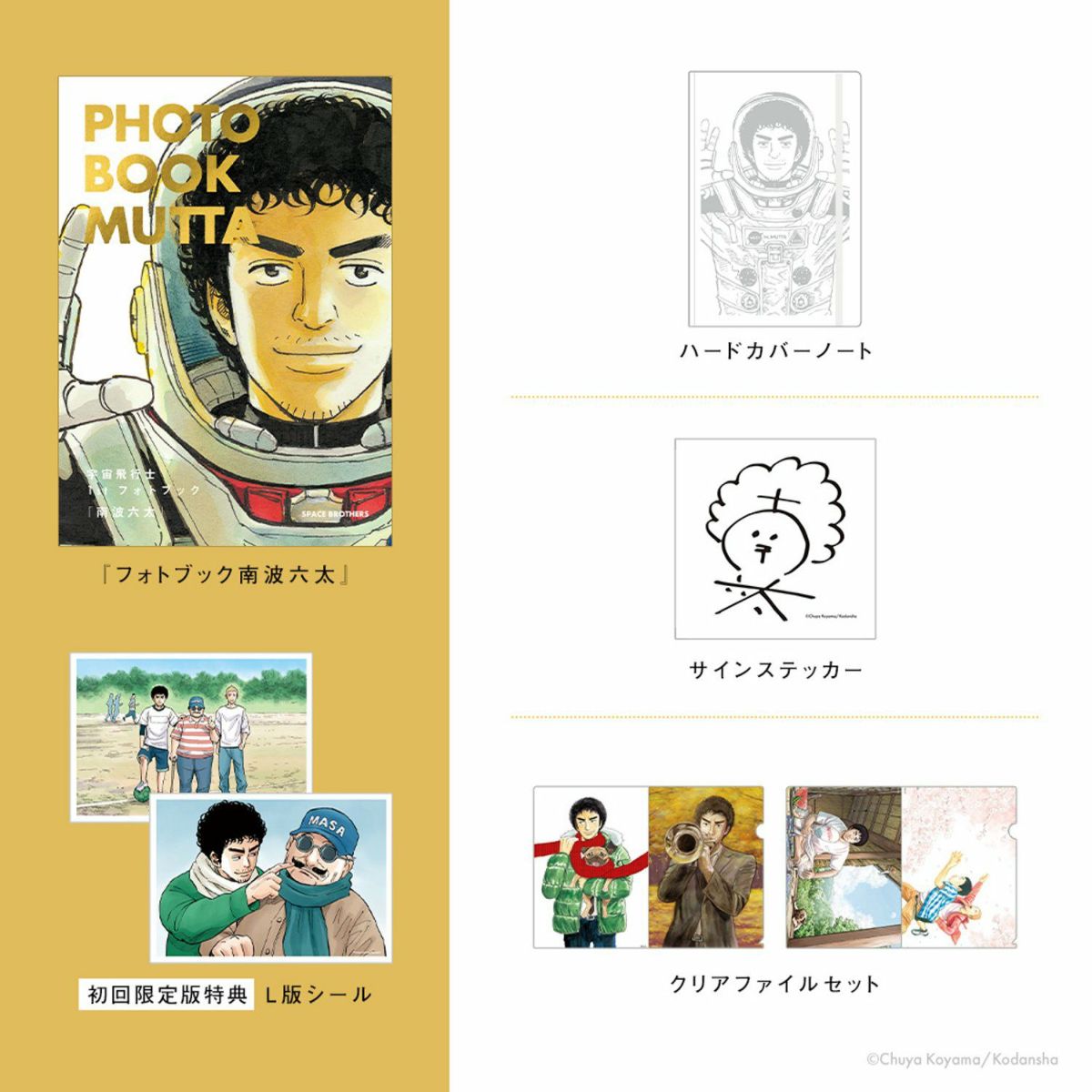 フォトブックの表紙を飾ったムッタのビジュアルのハードカバーノートなどスペシャルな南波六太グッズが揃いました。フォトブックの巻頭を飾る春夏秋冬のムッタの写真が入ったクリアファイルも。