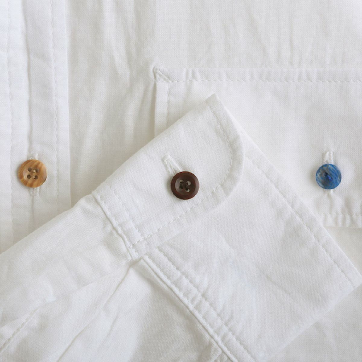 ボタンは全てナチュラルな木の素材。一見無表情なYシャツに温かみを与えるアクセントになってます。