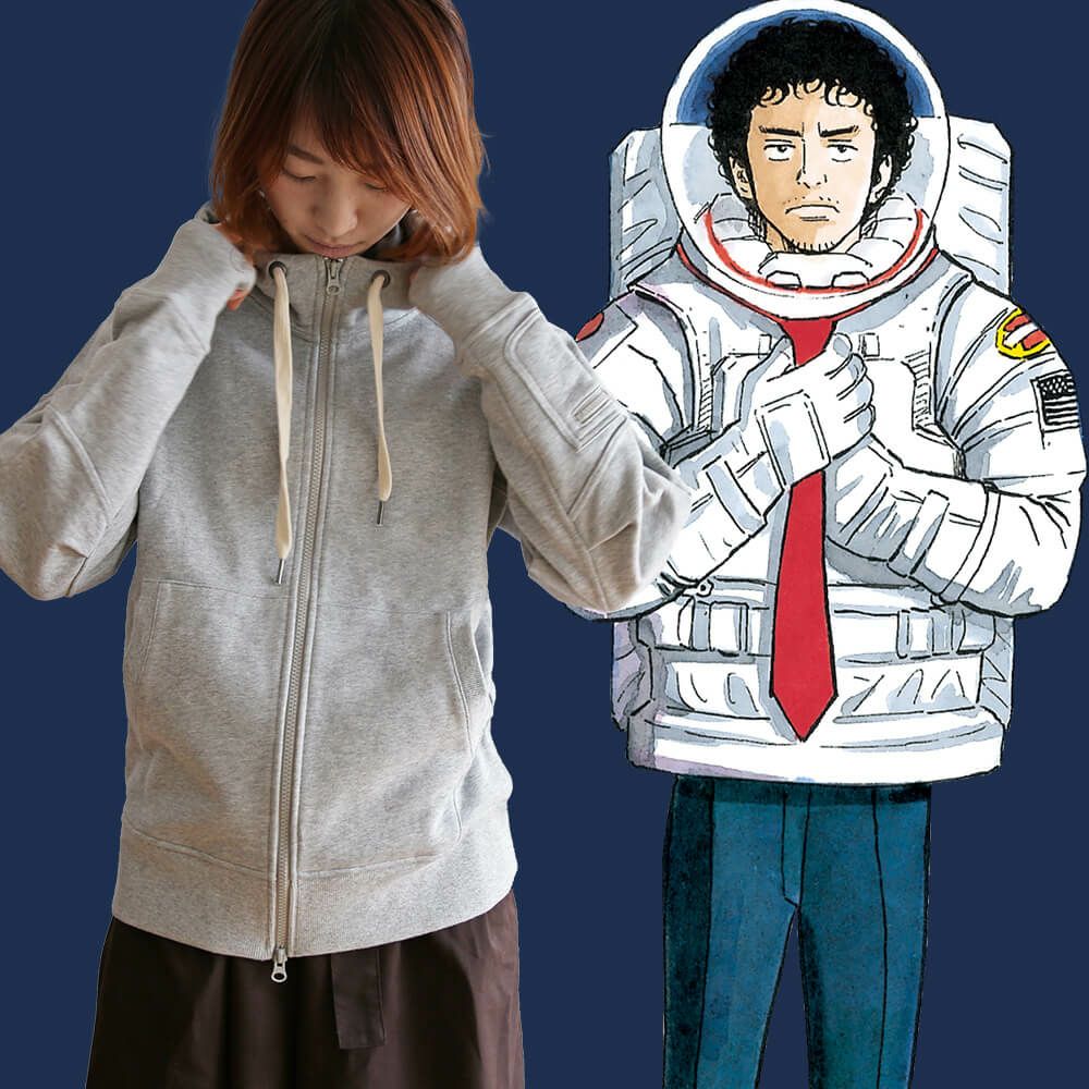 ムッタとヒビトが宇宙服を着て並んで立っている単行本14巻の表紙。ムッタは上半身だけですが、この時に2人が着ている宇宙服から着想を得て今回のパーカーが誕生しました。