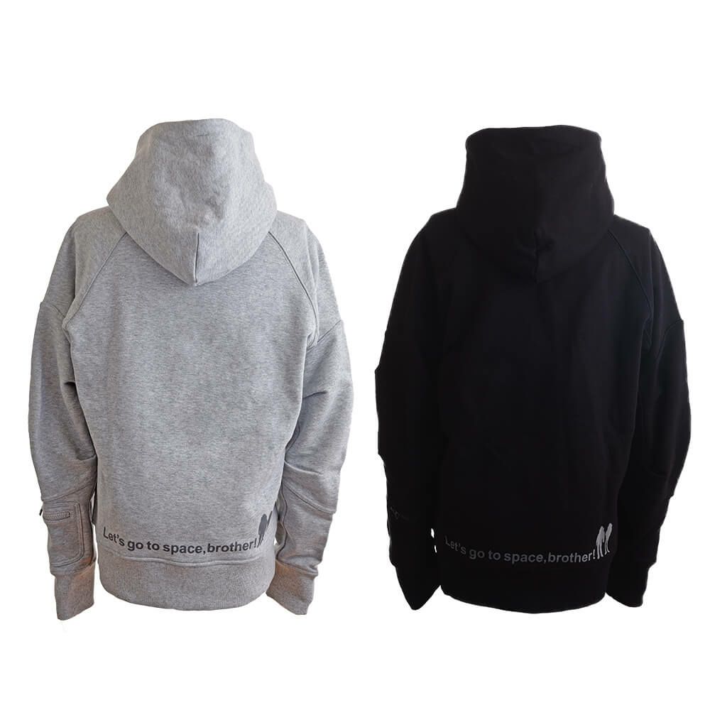 背中には、さり気なく「Let's go to space, brother! 」の言葉と14巻の表紙のムッタとヒビトのシルエットが。ムッタとヒビトの兄弟が、お互い切磋琢磨しあってついに宇宙飛行士に。そんな2人を象徴するかのような表紙デザインをシルエットにし、パーカーに入れ込みました。