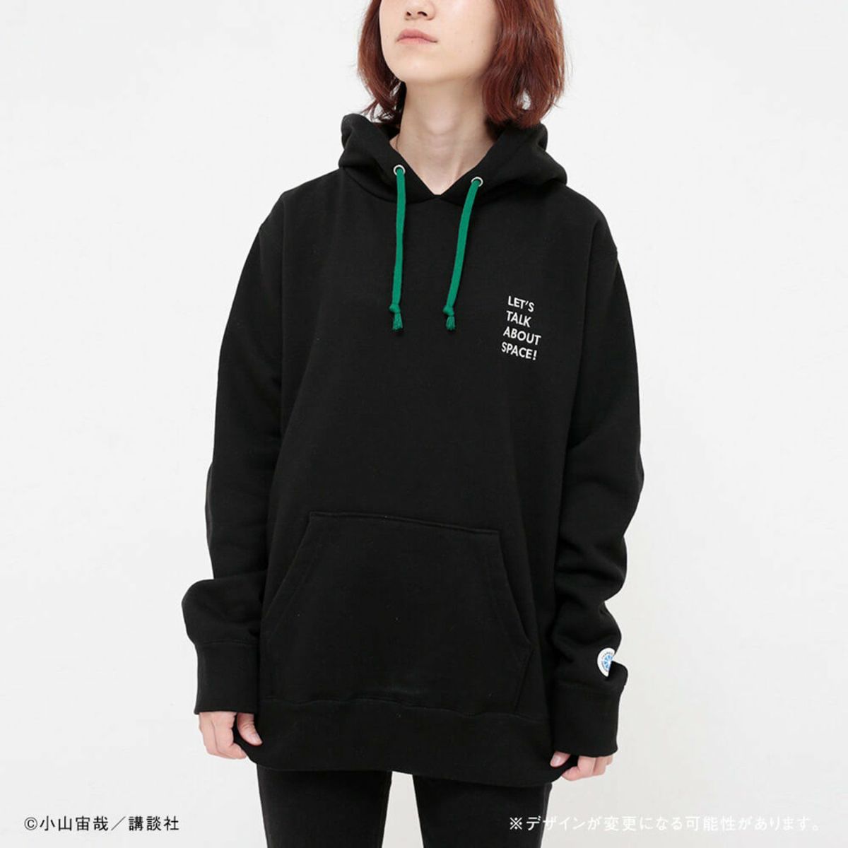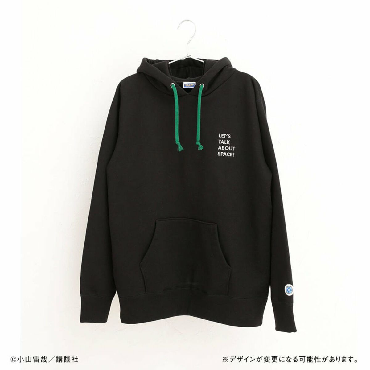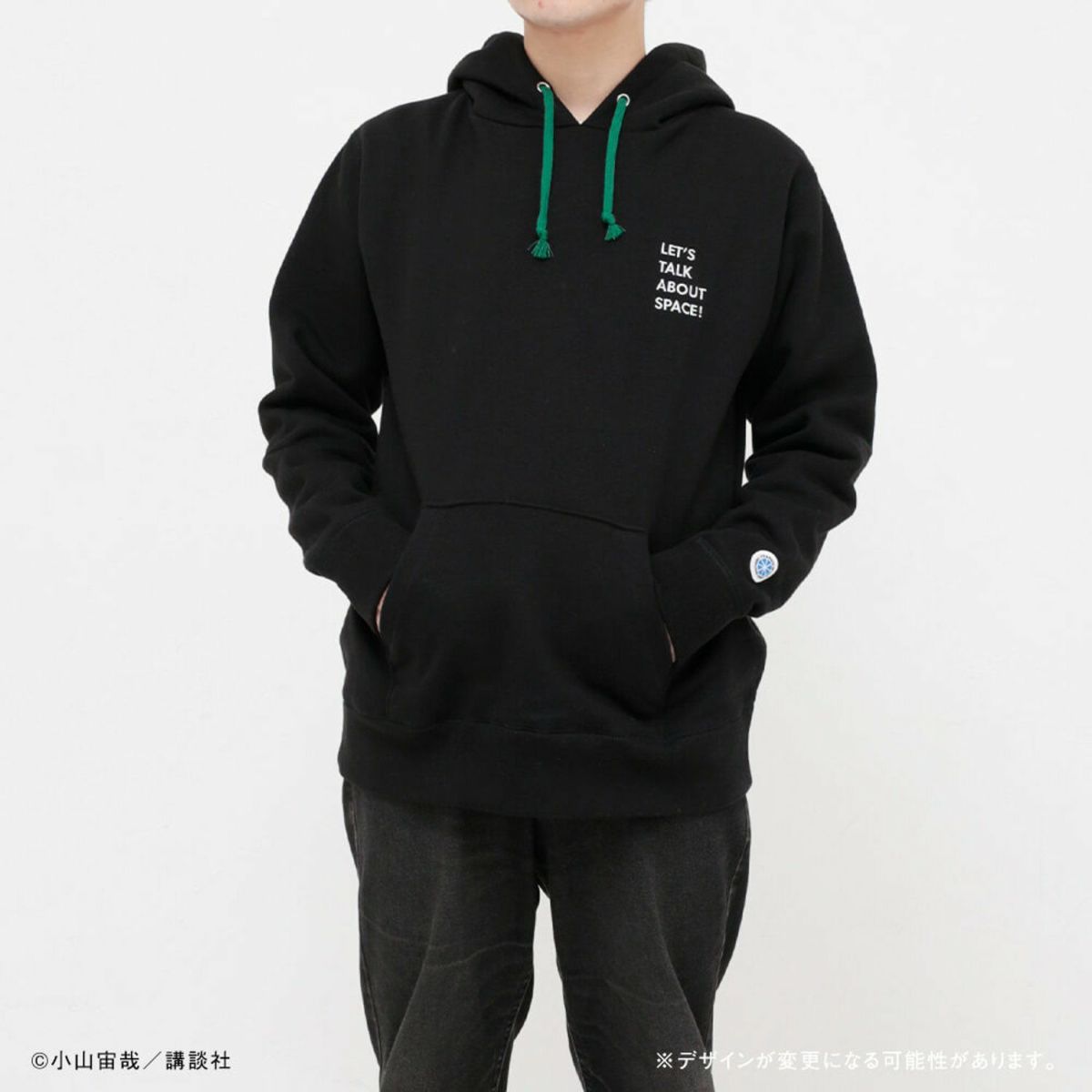 胸元には「Let’s talk about Space!」の言葉が。ムッタが宇宙飛行士選抜試験の最中に言った「宇宙の話をしよう」を英訳し、さり気なくあしらいました。パーカーを着れば、あなたもあの日のムッタのように、まっすぐに夢に向かう気持ちを確かめられるかもしれません!