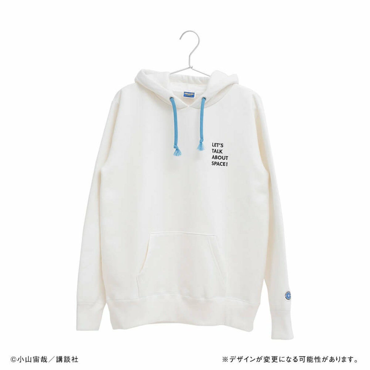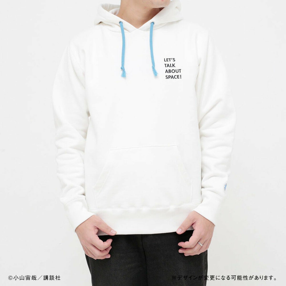 胸元には「Let’s talk about Space!」の言葉が。ムッタが宇宙飛行士選抜試験の最中に言った「宇宙の話をしよう」を英訳し、さり気なくあしらいました。パーカーを着れば、あなたもあの日のムッタのように、まっすぐに夢に向かう気持ちを確かめられるかもしれません!