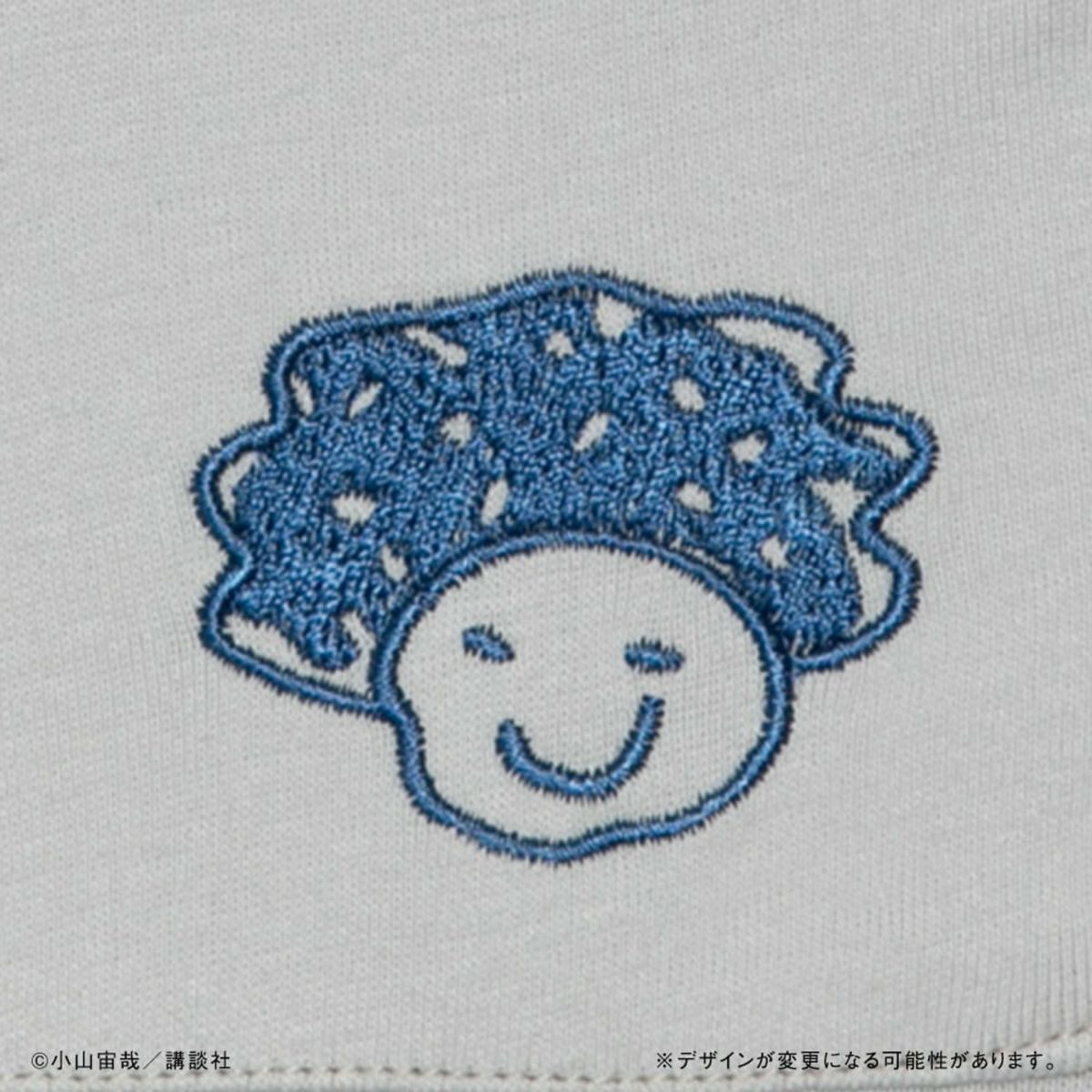 一見シンプルなデザインの「金ピカの一歩め」ルームウェア。男女共に着やすいシンプルなグレーのトップスには、胸ポケットの部分に、とっても可愛いムッタが…!これは、『宇宙兄弟』の作品の中で、シャロンが描いたムッタの似顔絵を刺繍にしたものです。