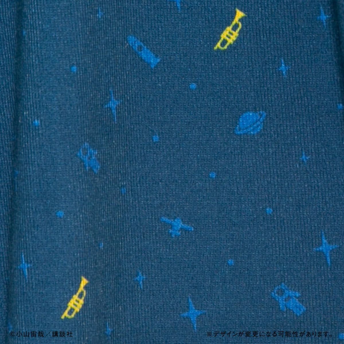 パンツは、ネイビーの生地に、可愛らしい宇宙&金ピカトランペットがさりげなく散りばめられた総柄。総柄とは言え目立ちすぎない柄なので、男女共にお楽しみ頂けるデザインです。