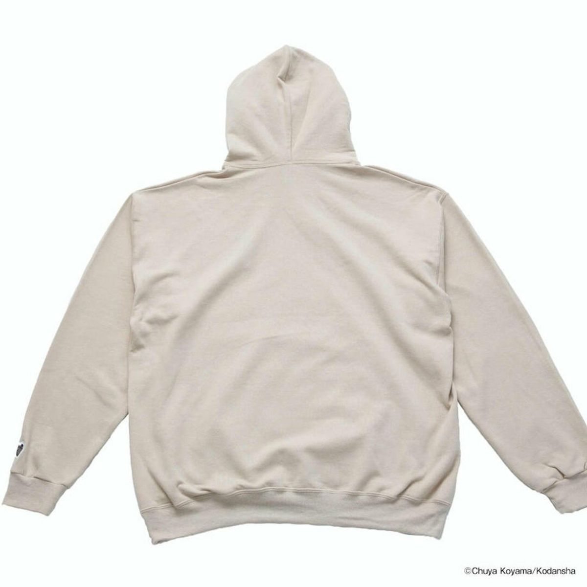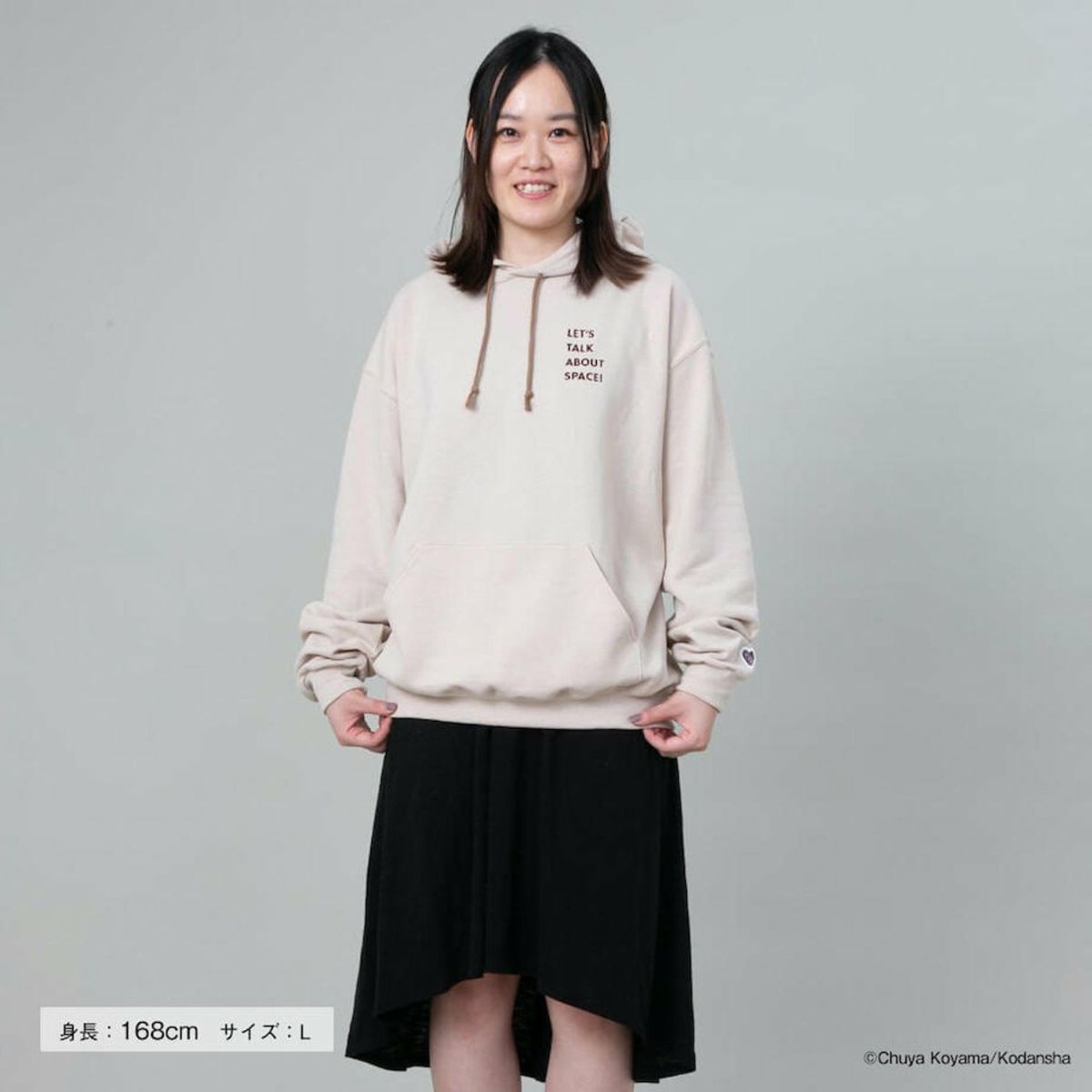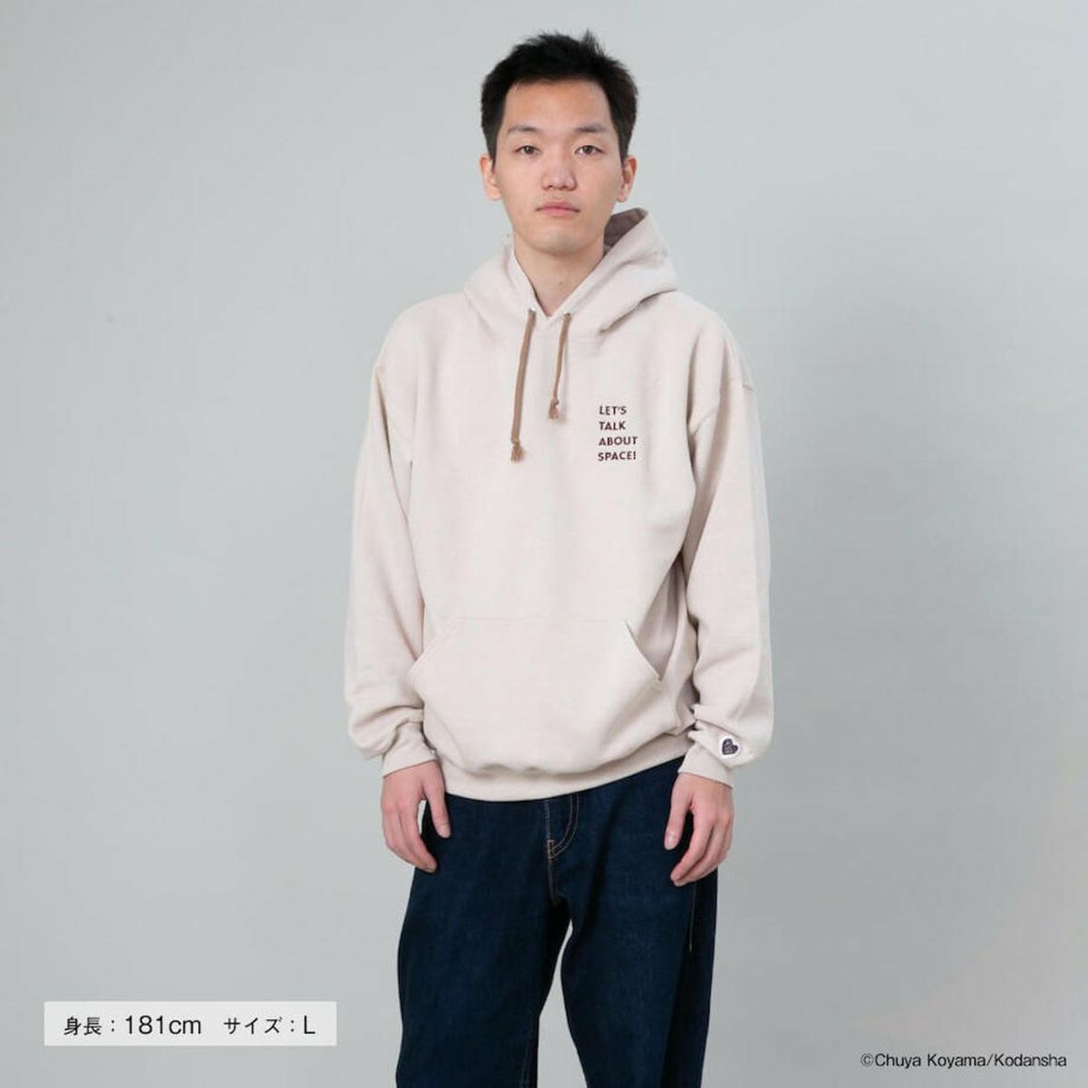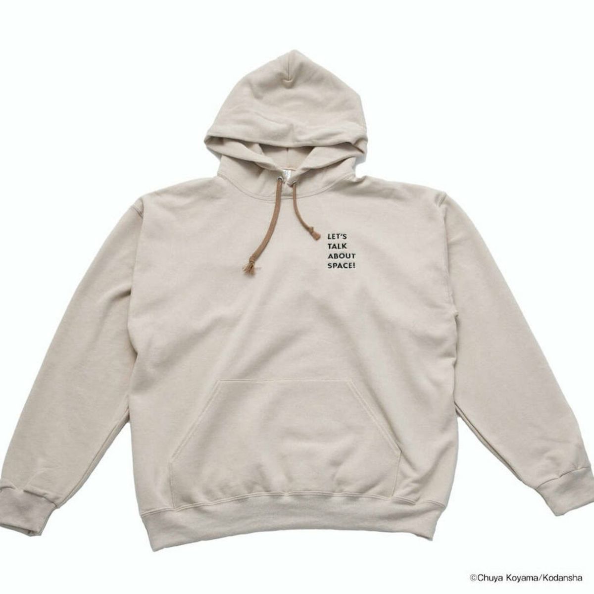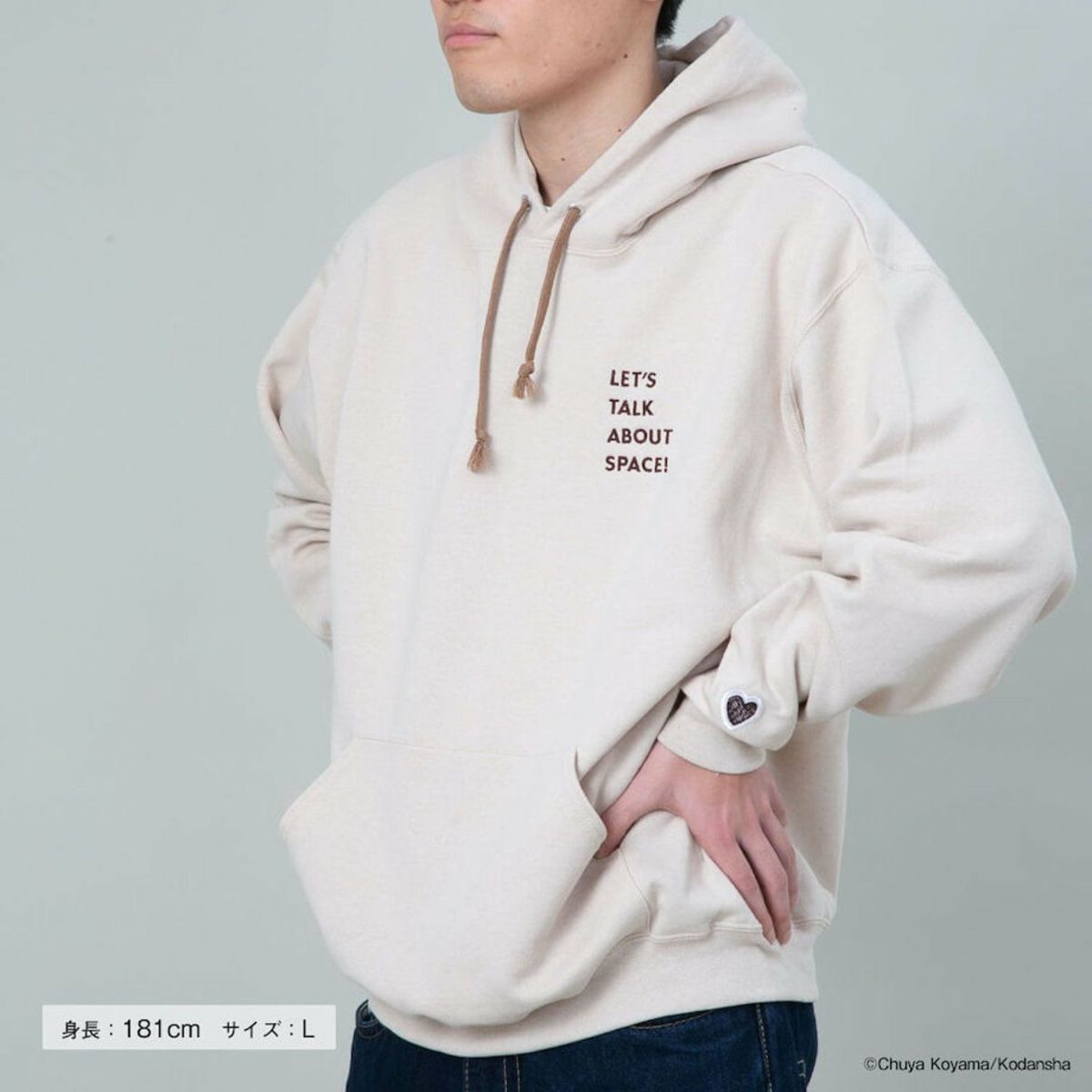 胸元には「Let’s talk about Space!」の言葉が。ムッタが宇宙飛行士選抜試験の最中に言った「宇宙の話をしよう」を英訳し、さり気なくあしらいました。パーカーを着れば、あなたもあの日のムッタのように、まっすぐに夢に向かう気持ちを確かめられるかもしれません!