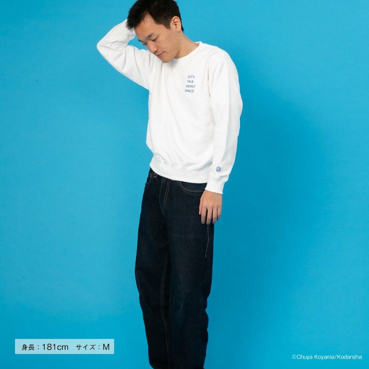 胸元には「Let’s talk about Space!」の言葉が。ムッタが宇宙飛行士選抜試験の最中に言った「宇宙の話をしよう」を英訳し、さり気なくあしらいました。パーカーを着れば、あなたもあの日のムッタのように、まっすぐに夢に向かう気持ちを確かめられるかもしれません!