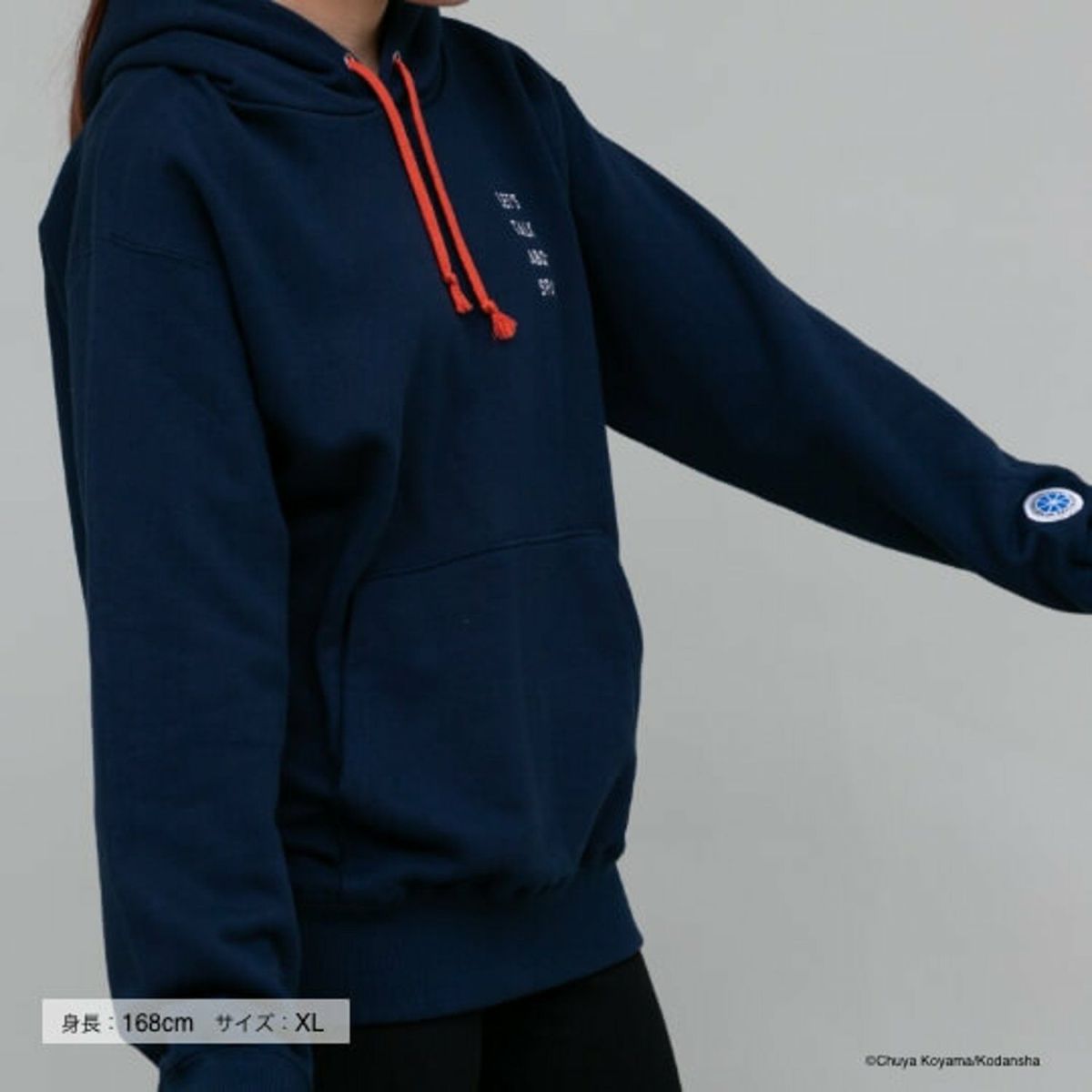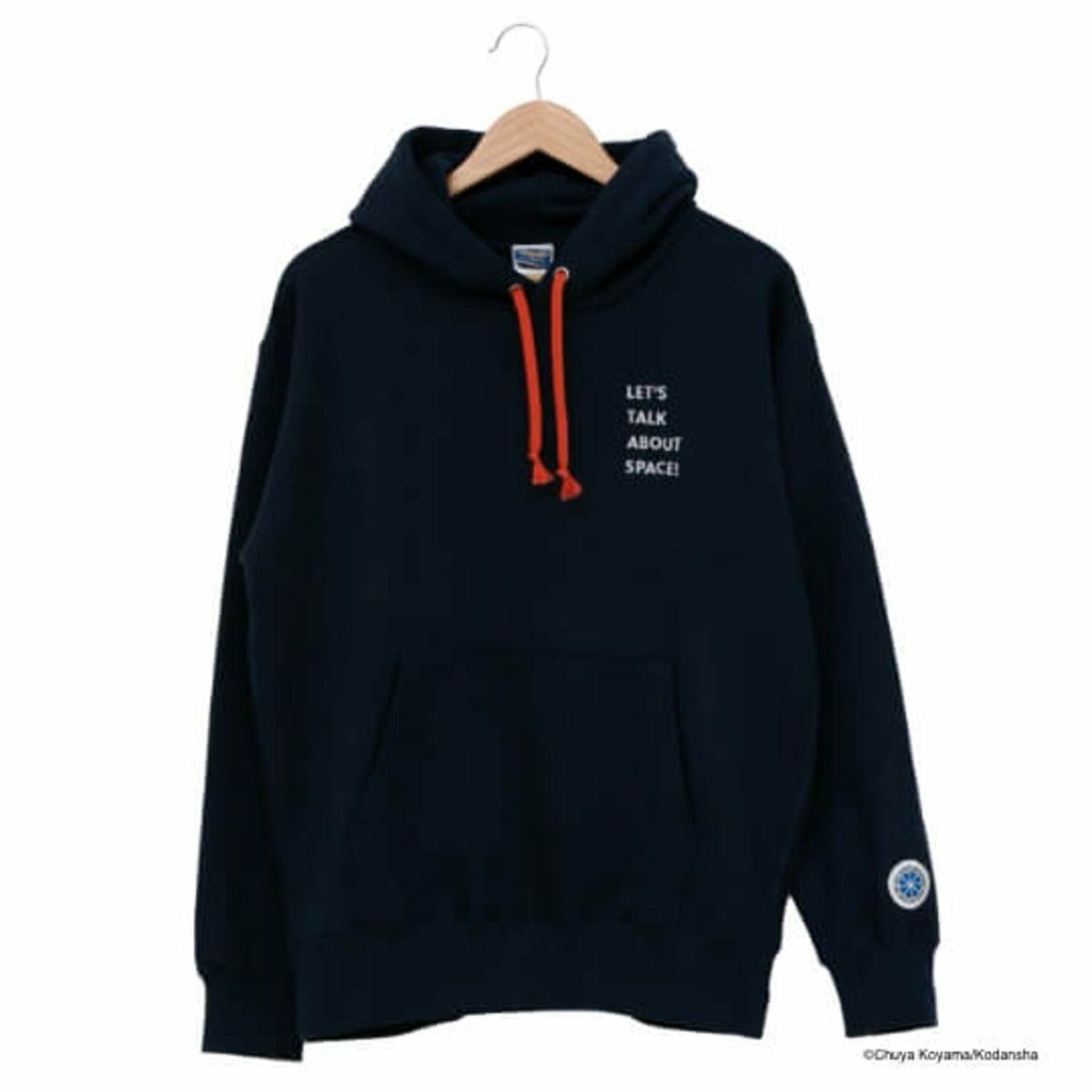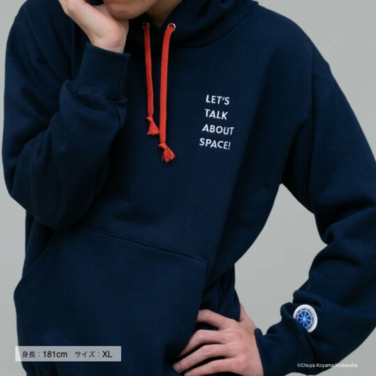 胸元には「Let’s talk about Space!」の言葉が。ムッタが宇宙飛行士選抜試験の最中に言った「宇宙の話をしよう」を英訳し、さり気なくあしらいました。パーカーを着れば、あなたもあの日のムッタのように、まっすぐに夢に向かう気持ちを確かめられるかもしれません!