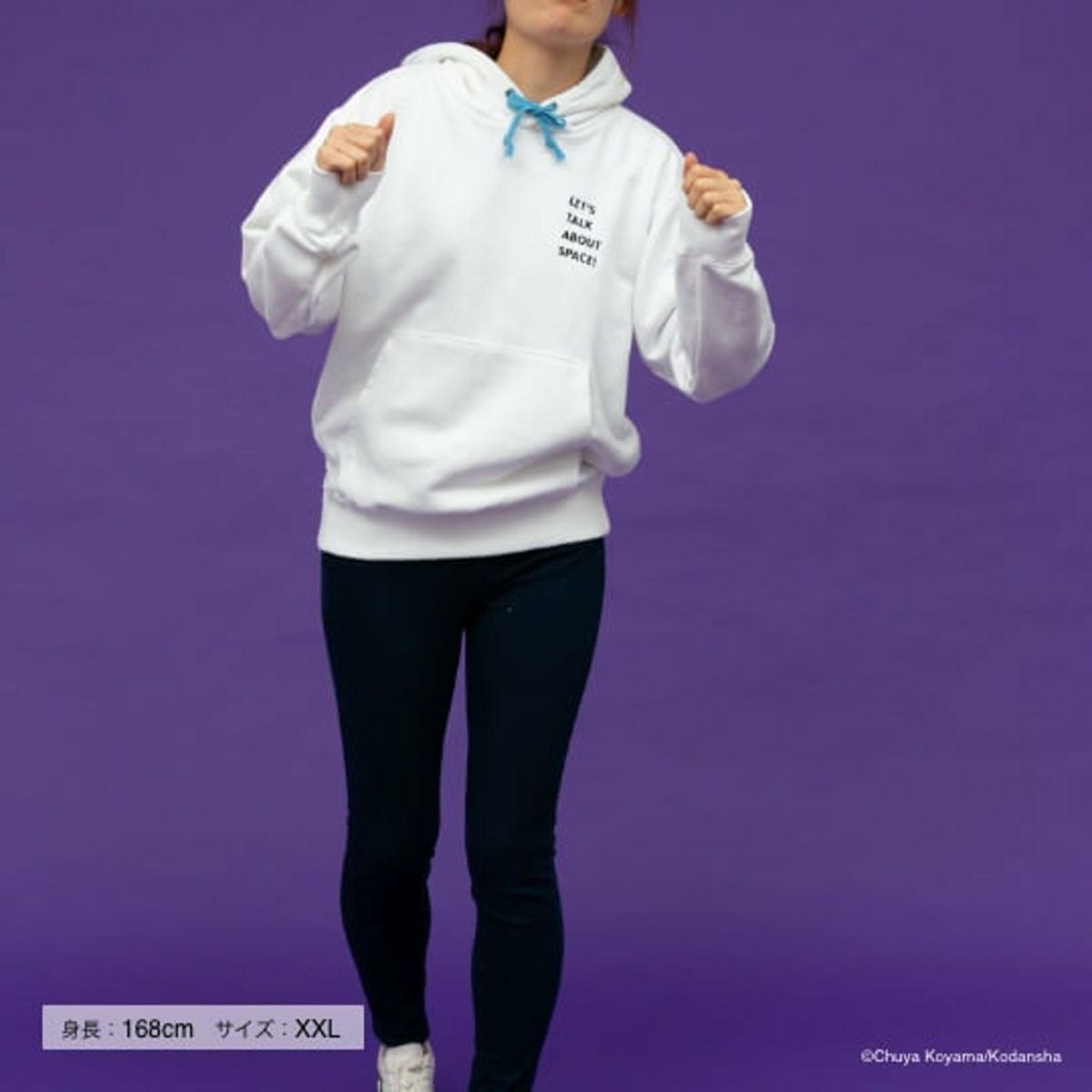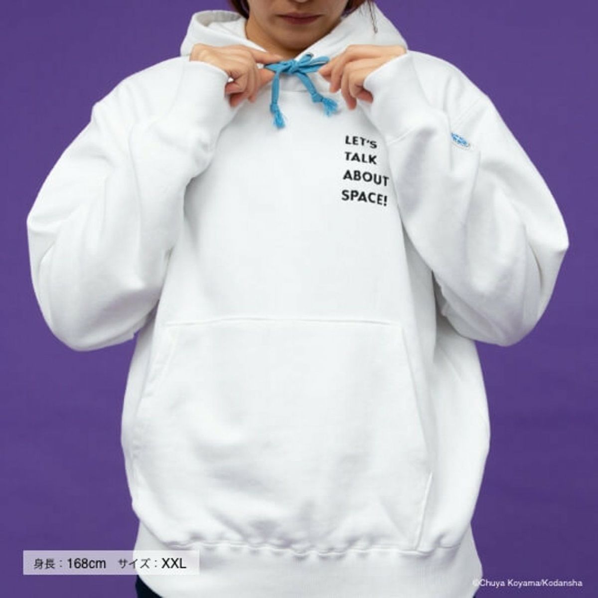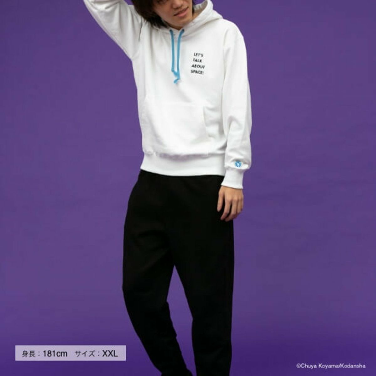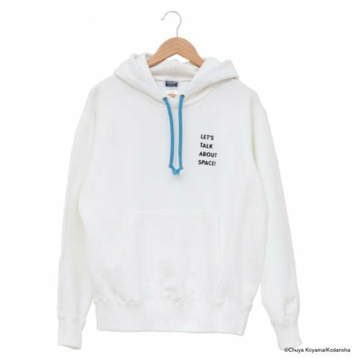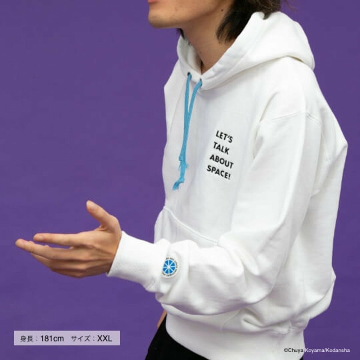 胸元には「Let’s talk about Space!」の言葉が。ムッタが宇宙飛行士選抜試験の最中に言った「宇宙の話をしよう」を英訳し、さり気なくあしらいました。パーカーを着れば、あなたもあの日のムッタのように、まっすぐに夢に向かう気持ちを確かめられるかもしれません!