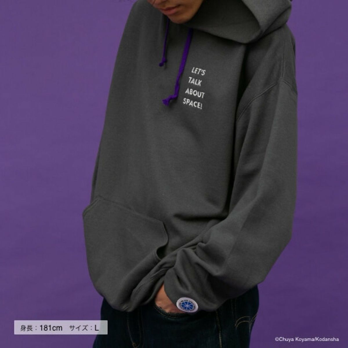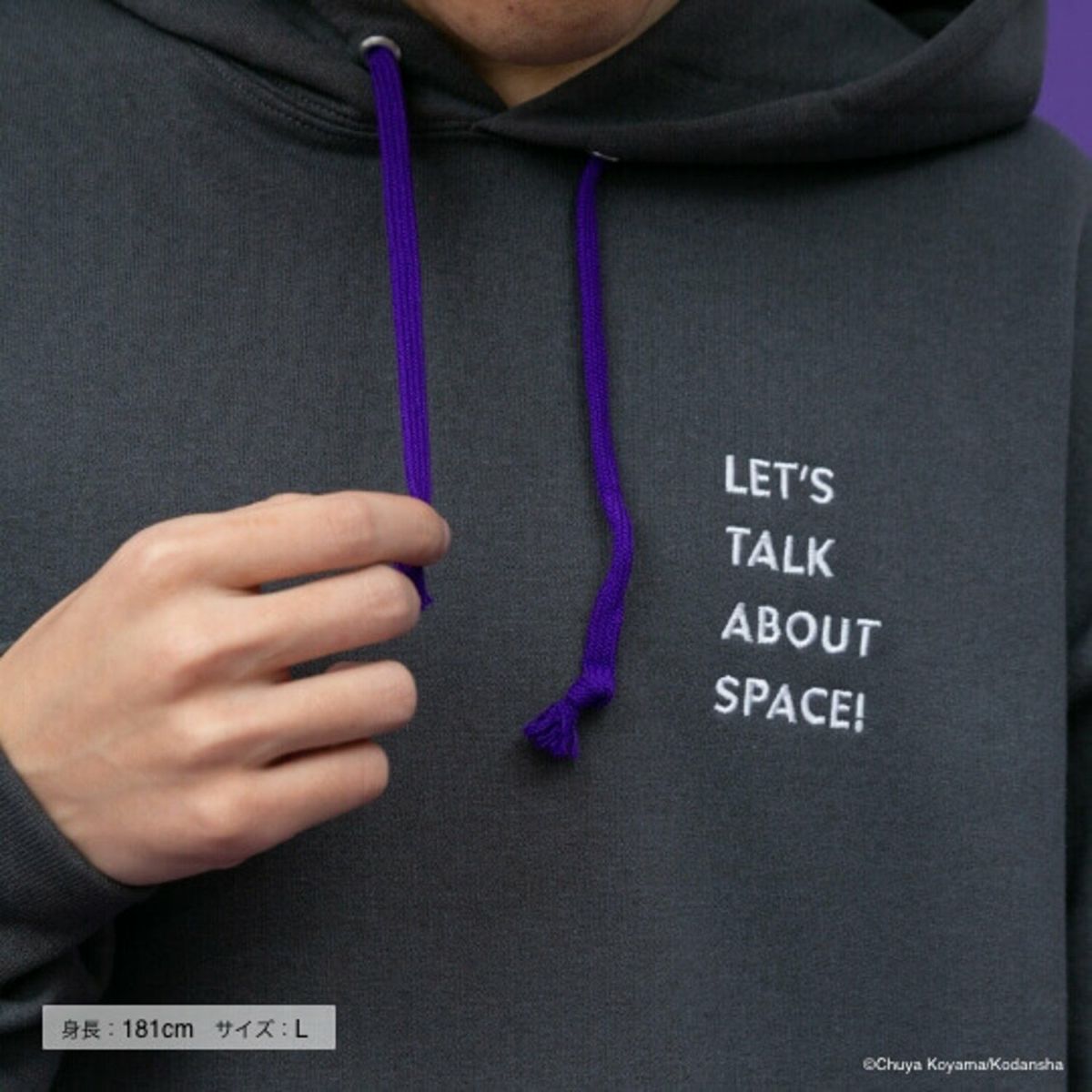 胸元には「Let’s talk about Space!」の言葉が。ムッタが宇宙飛行士選抜試験の最中に言った「宇宙の話をしよう」を英訳し、さり気なくあしらいました。パーカーを着れば、あなたもあの日のムッタのように、まっすぐに夢に向かう気持ちを確かめられるかもしれません!