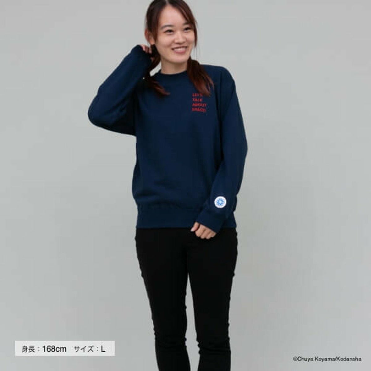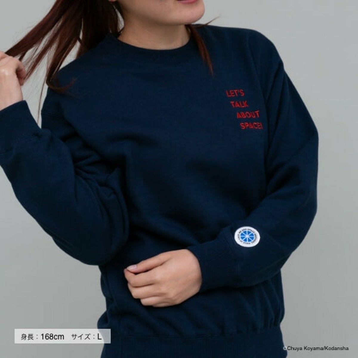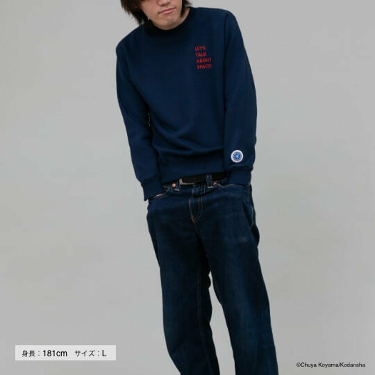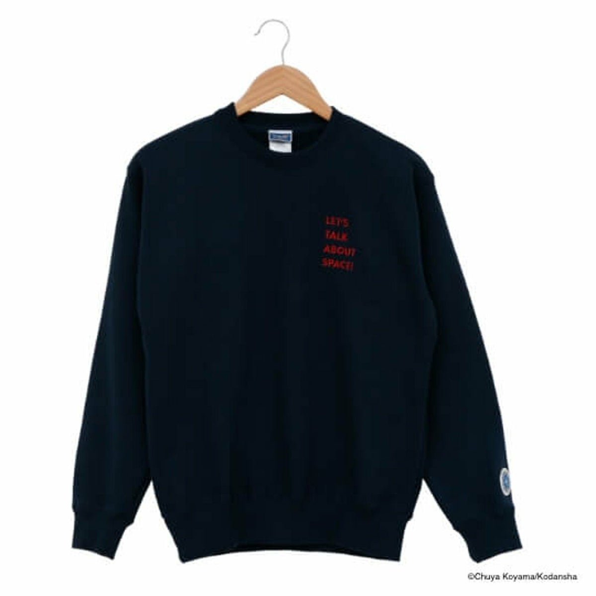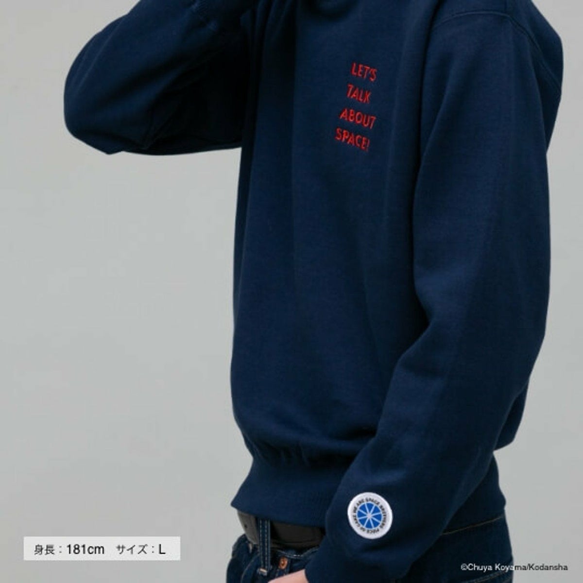 胸元には「Let’s talk about Space!」の言葉が。ムッタが宇宙飛行士選抜試験の最中に言った「宇宙の話をしよう」を英訳し、さり気なくあしらいました。パーカーを着れば、あなたもあの日のムッタのように、まっすぐに夢に向かう気持ちを確かめられるかもしれません!