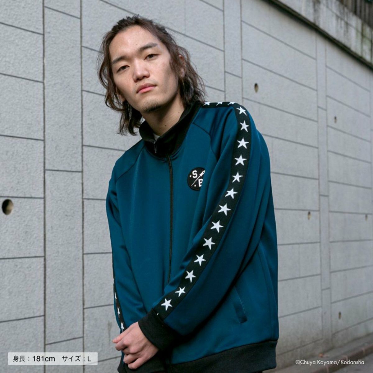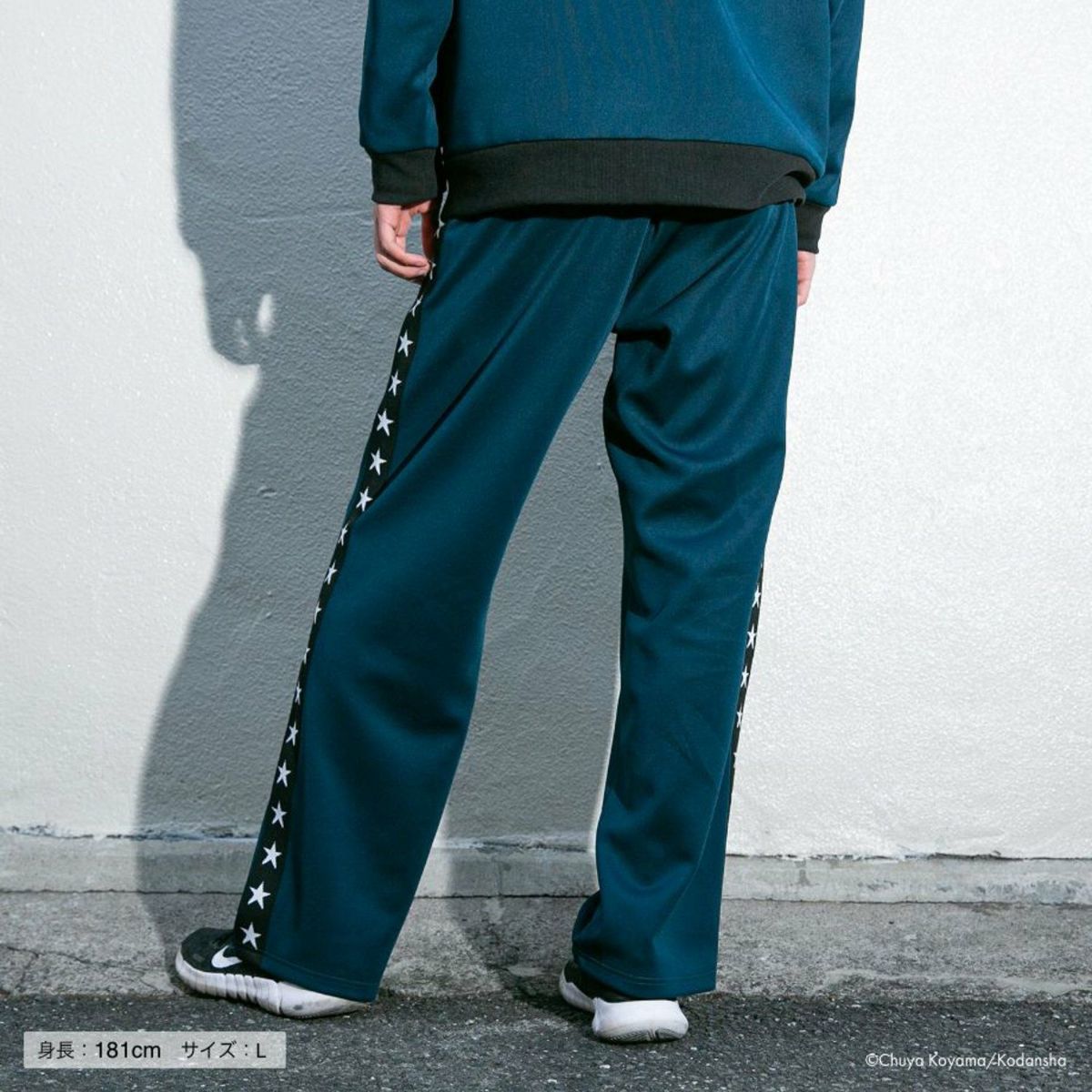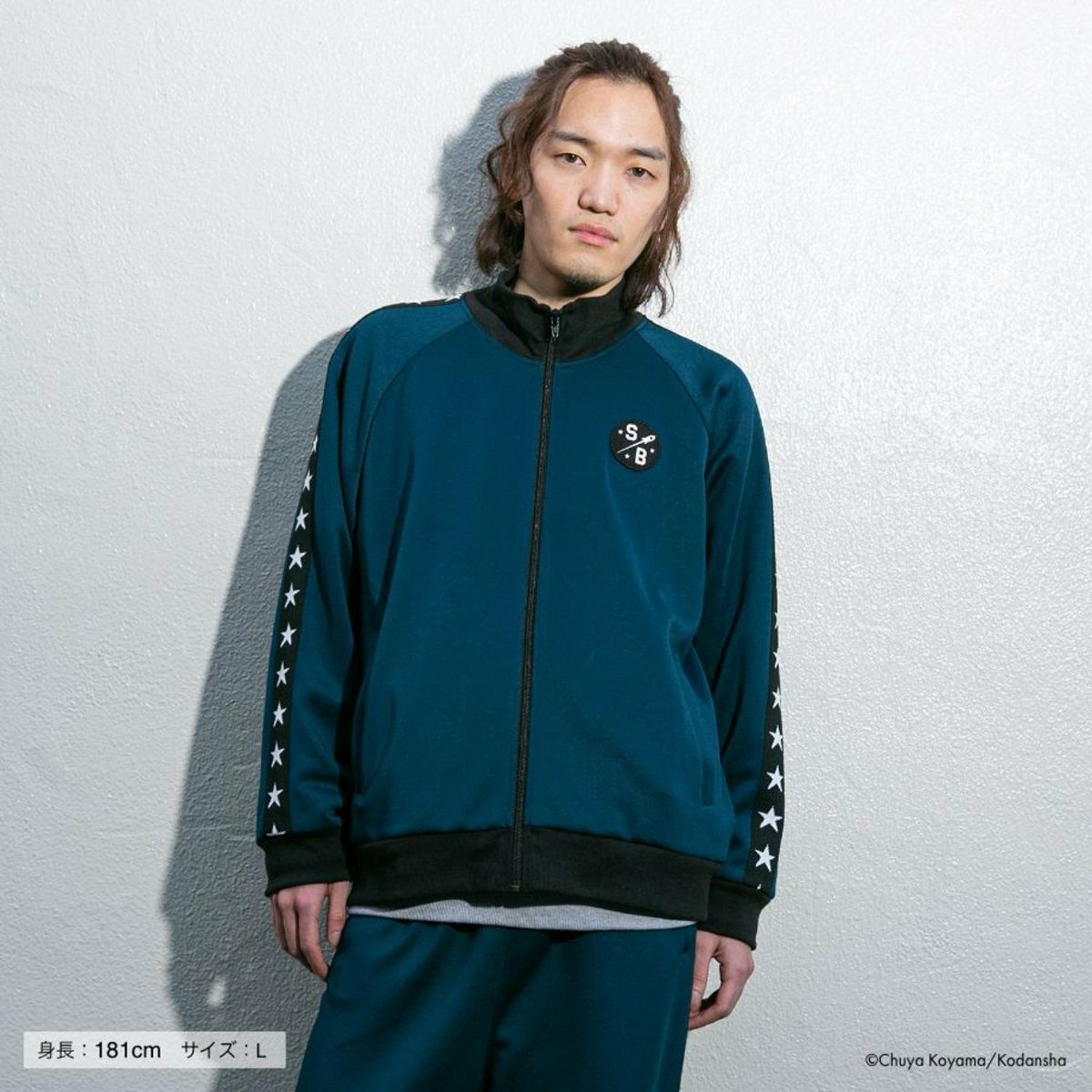 作中のジャージで描かれた、星のサイドラインをポイントに、胸元と背中、パンツのポケット位置に、パッチや刺繍を施しました。