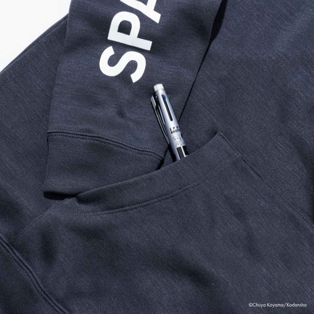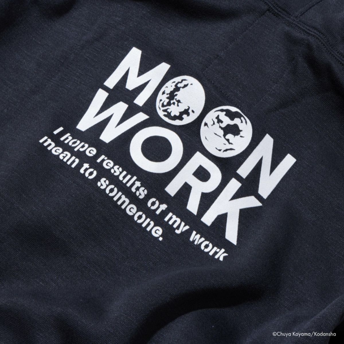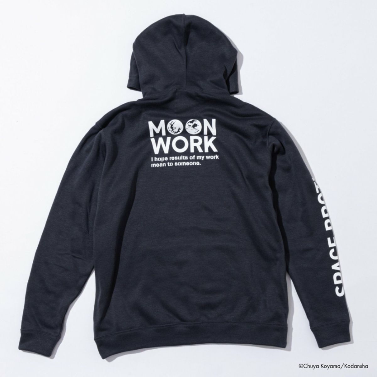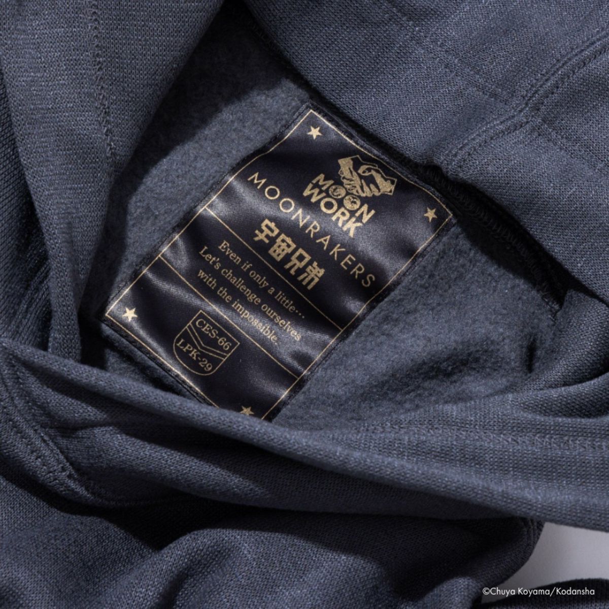 右袖には、SPACE BROTHERSのロゴが大きく入り、バックプリントも。アクティブな印象に仕上がりました。バックプリントには、月と地球をモチーフにしたMOONWORKのロゴと、35巻のムッタの言葉「やったことの結果が 誰かの"意味あること"になればいいんだ」のセリフを英文でデザインしました。フードに紐がついていないので、動き回ったり、お料理をしたり、モノの運搬など作業時にもおすすめです。