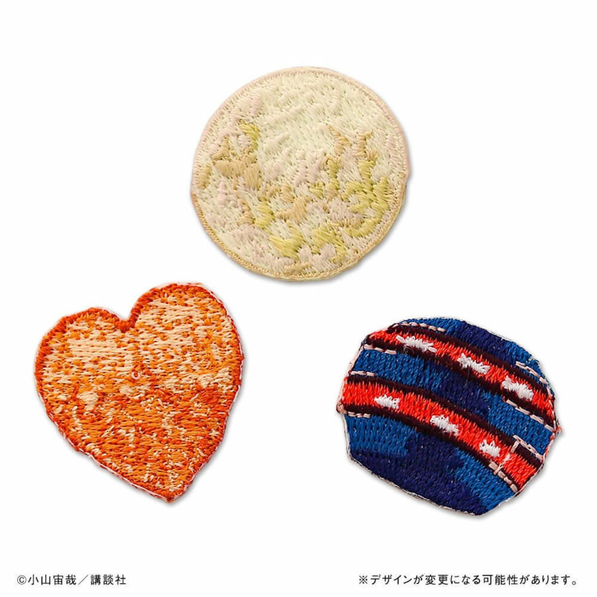 ムッタとヒビトが宇宙飛行士を目指す決意をした夜の月、ヒビトの手作りUFO、たぶさんのハートコロッケ。ムッタ、ヒビト、せりかにゆかりのあるアイテムが、3つセットのワッペンになりました!