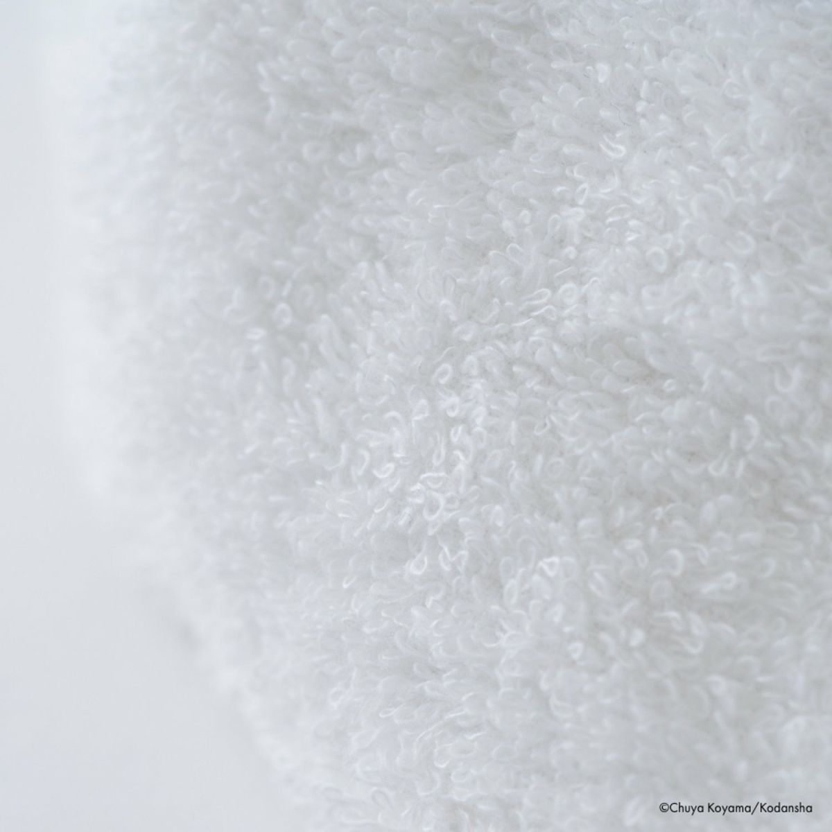 生地は、被りやすさを重視してホワイトのタオル素材。今治生産生地に、ヒビトがマクシムに背中を叩いてもらっていたヴィヒタの繊維を織り込みました。