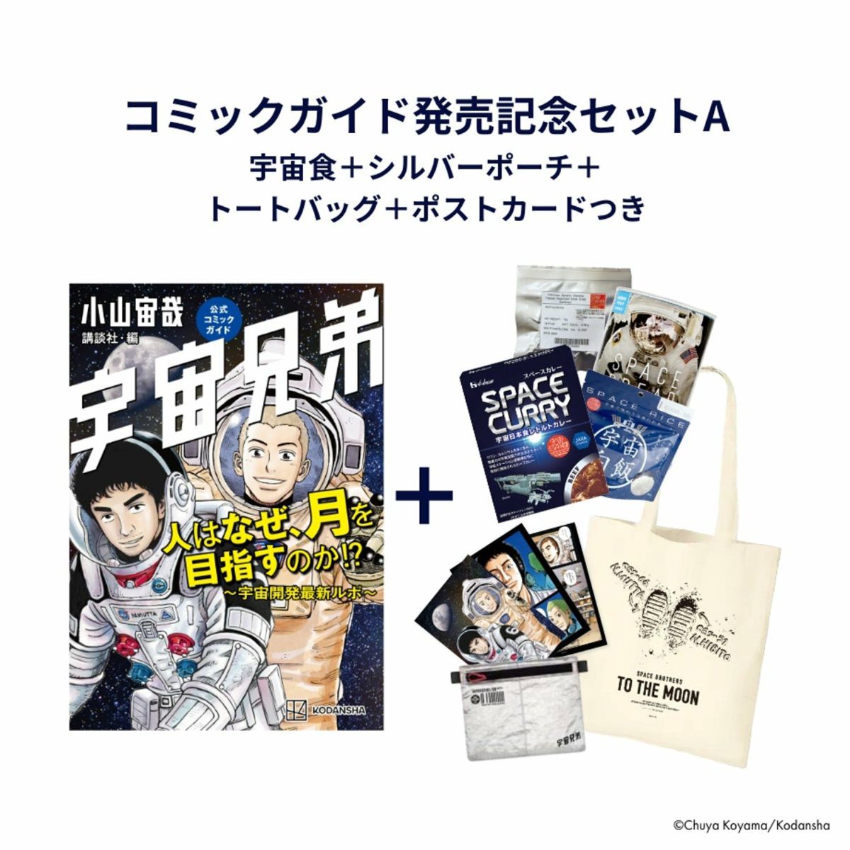また、「宇宙に行きたい」と少年時代に思い描いた夢、夢をリアルなものに実現させた物語を思い起こさせる、ムッタとヒビトの月面足跡をプリントしたトートバッグと、月を目指してドキドキワクワクしているキャラクターポストカードも入ります!