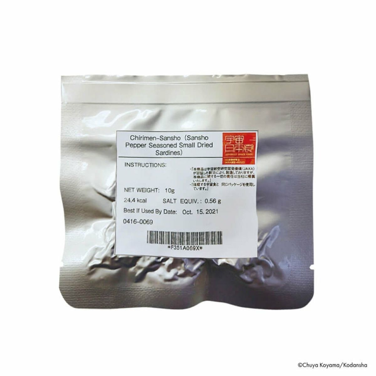 2020年3月13日に宇宙日本食に認証された「ちりめん山椒」。真空処理の工程によってちりめんじゃこ同士がくっつき固まるため、散らばることなくむしろ食べやすい形にまとまるとのこと。パッケージはISSに搭載される商品のレプリカ版。