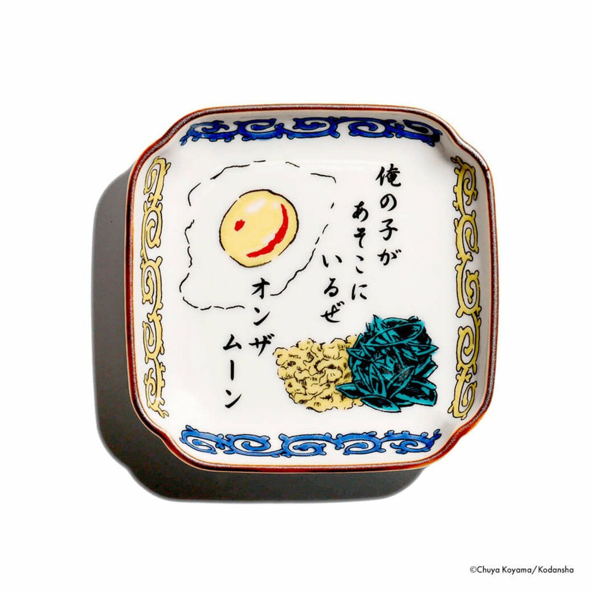 ヒビトがいる月を見ながら南波父が詠んだ一句「俺の子が あそこにいるぜ オンザムーン」。そんな名句を引き立たせる月見うどん柄の1枚です!卵や薬味はもちろん、フレーム部分には、中華皿の「雷文」のようにうどんが文様となってあしらわれています。