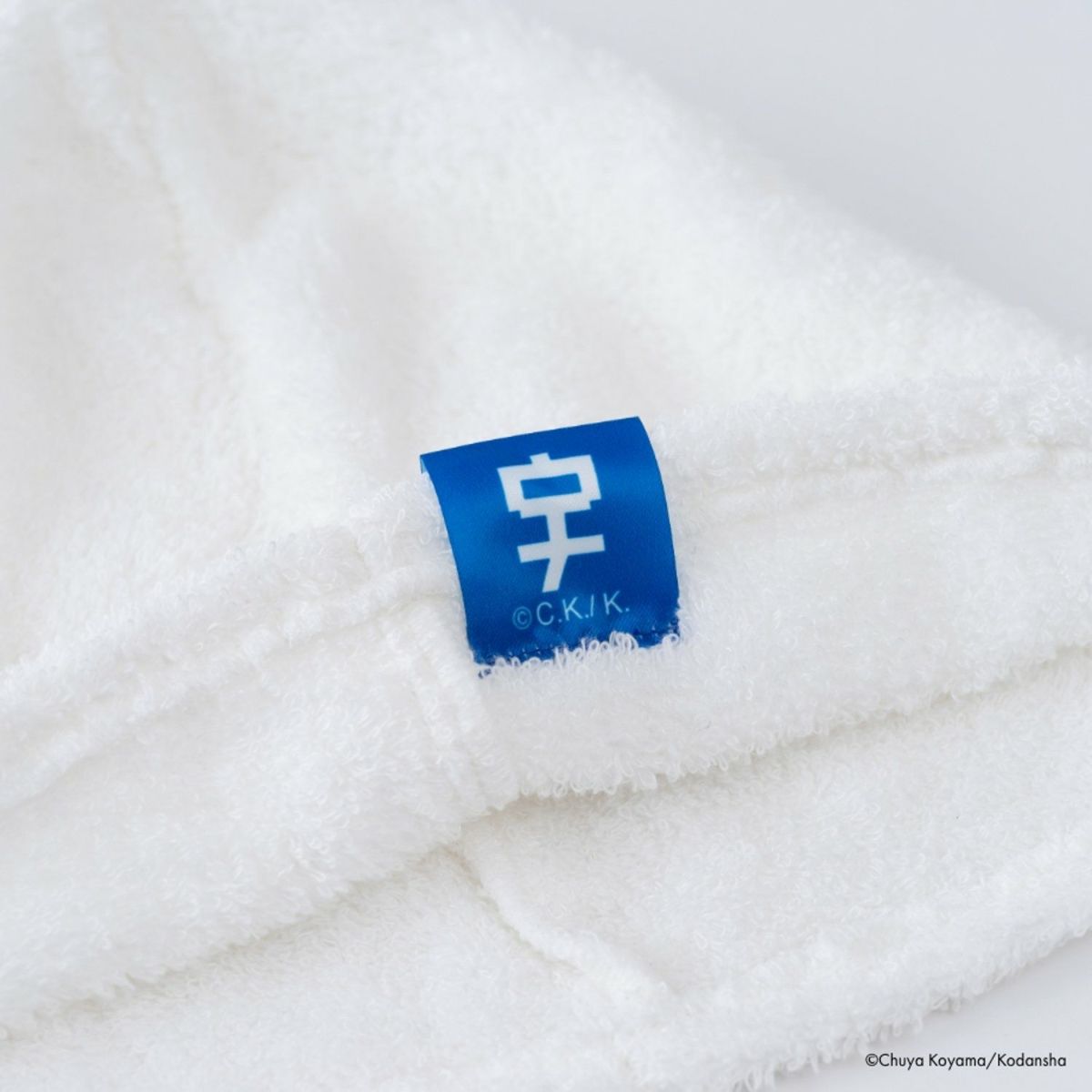 生地は、被りやすさを重視してホワイトのタオル素材。今治生産生地に、ヒビトがマクシムに背中を叩いてもらっていたヴィヒタの繊維を織り込みました。