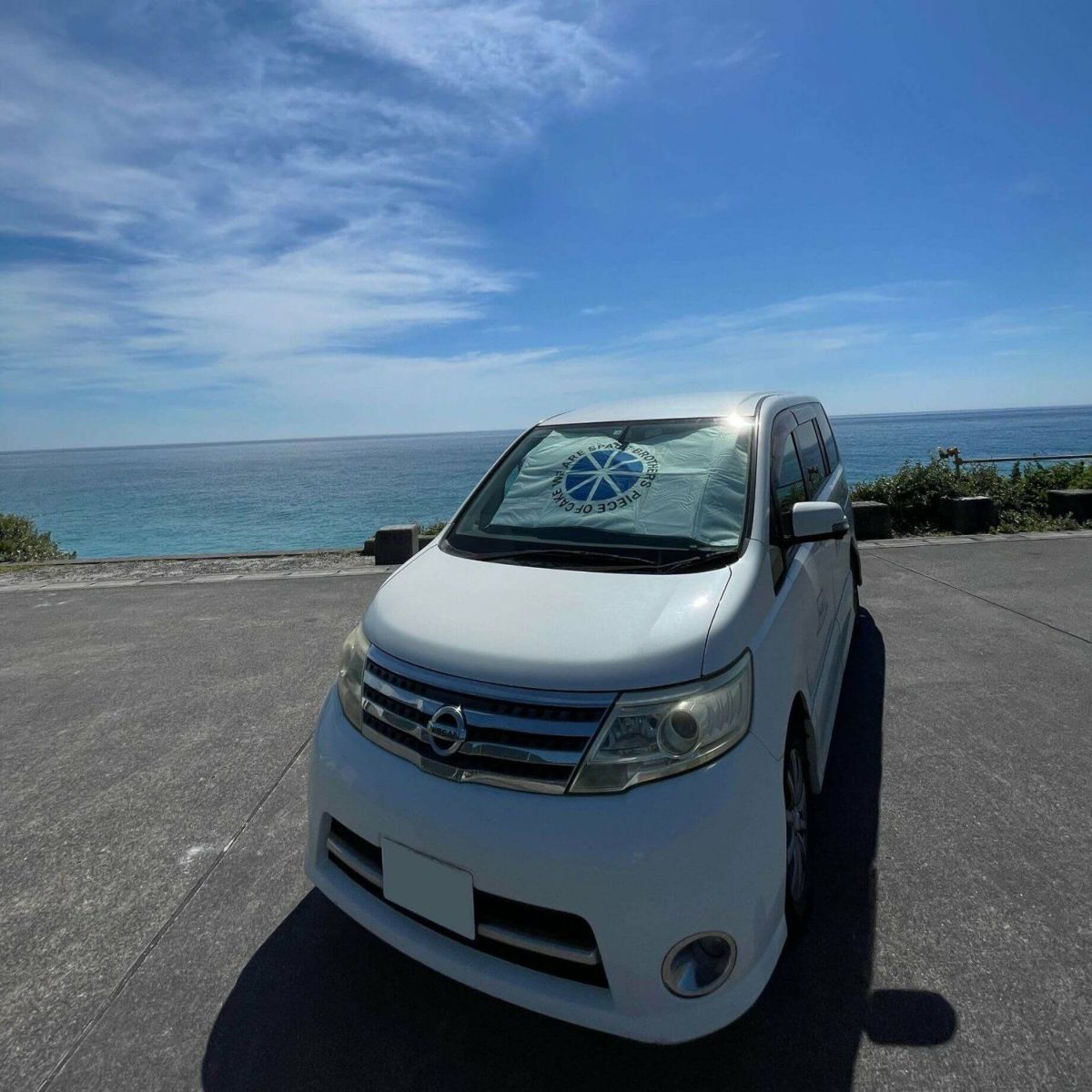 車を日差しから守り、暑さ対策として活躍するフロントガラス用サンシェードを作りました。ワンポイントでシンボルマークが入ったデザイン。お出かけで駐車場に停めたときにも、車を発見しやすいかも!?