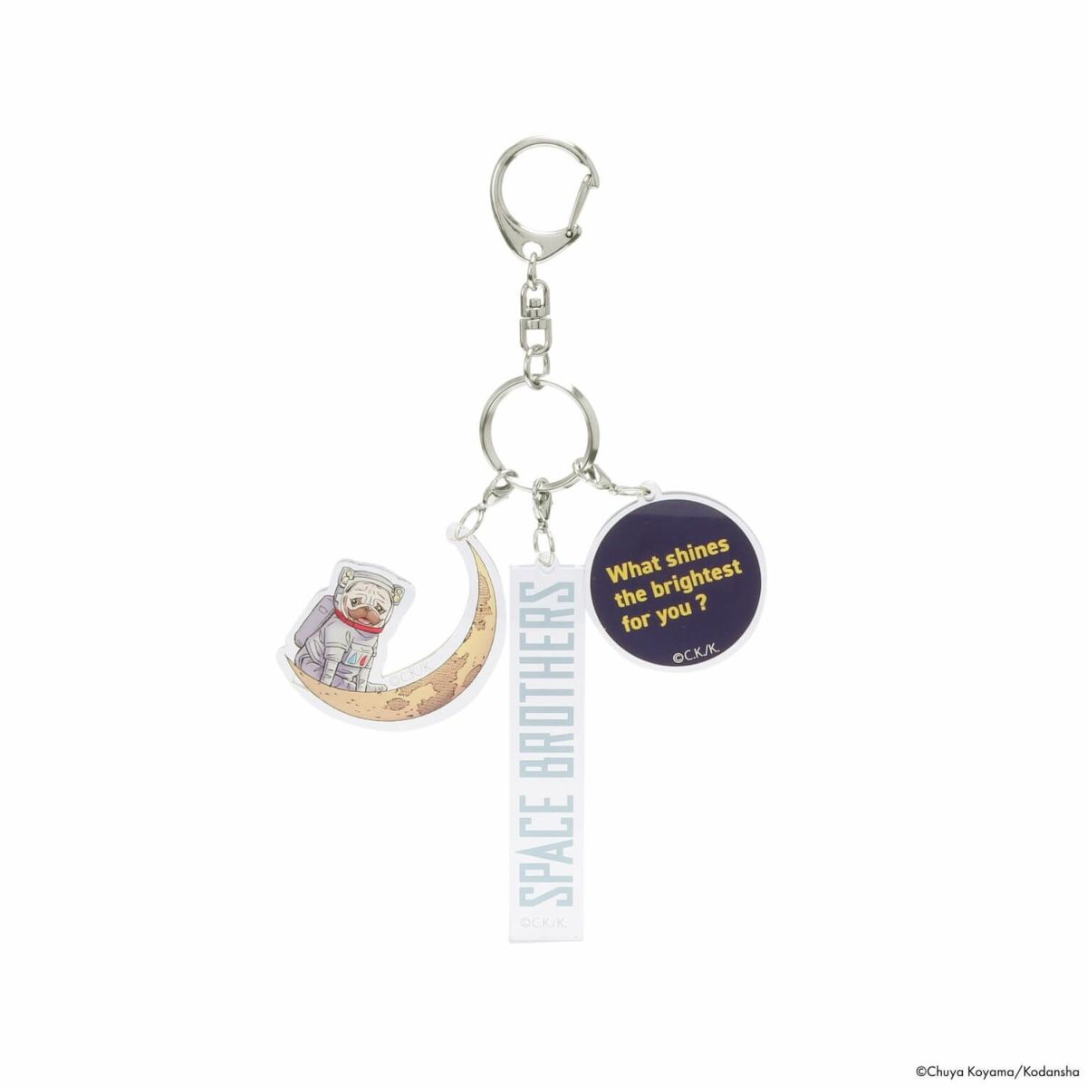 キャラクター、名言、ロゴ──宇宙兄弟の世界を詰め込んだ3つのチャームが連なるアクリルキーホルダーです。