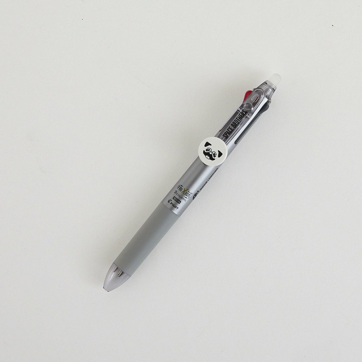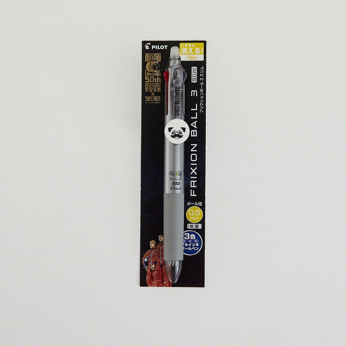 消せる3色ボールペン『フリクションボール3スリム』一般筆記に適した0.5mmの極細タイプで、インキ色は黒・赤・青の3色です。筆跡の消去はペン後部の消去用ラバーで擦ることでスムーズに行えます。「MOON LANDING 50th ANNIVERSARY」「宇宙兄弟×うめだ阪急」のロゴが入った特別仕様。ポケットに差した際にちらっとのぞくアポの顔がとてもキュートなデザインです。