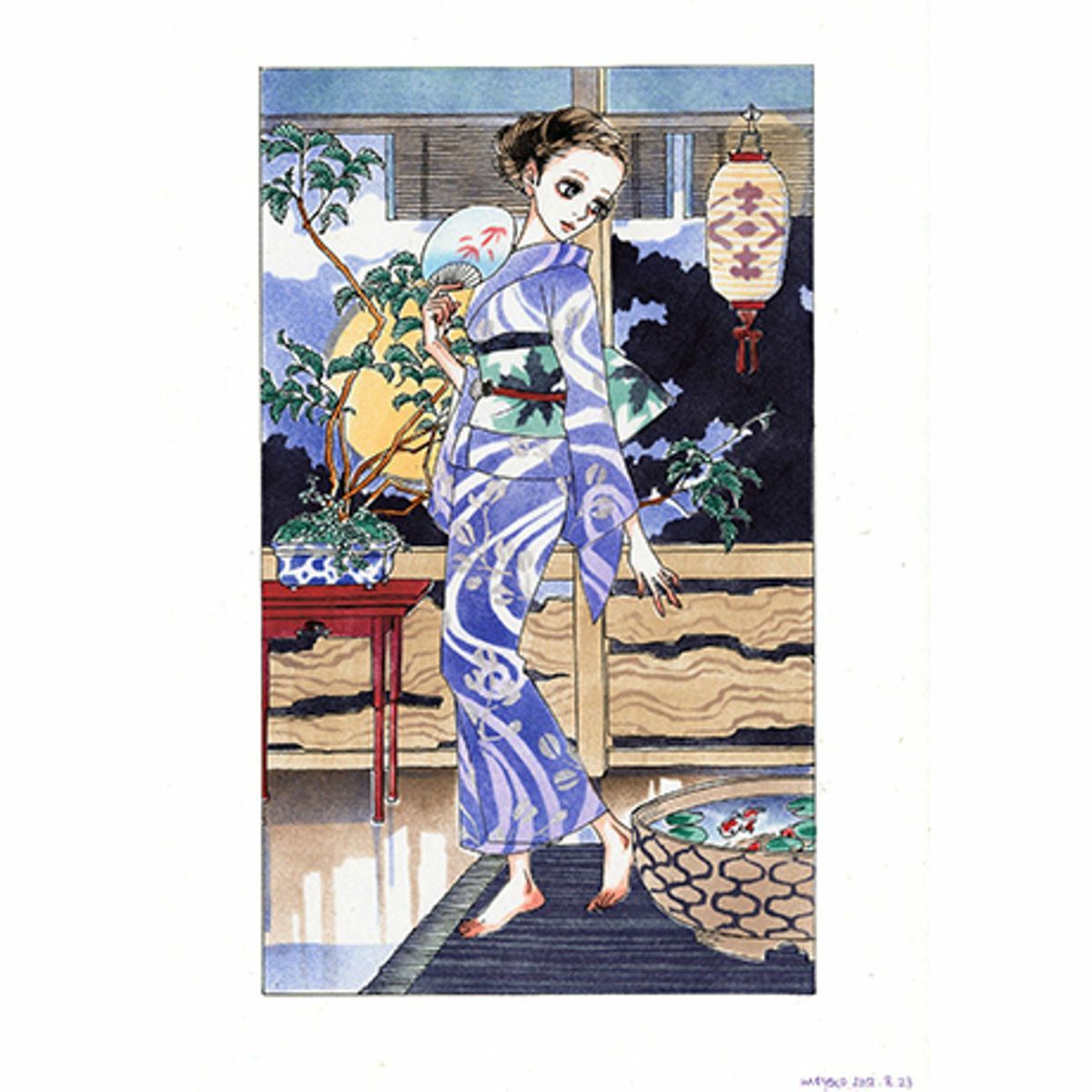 2013年『安野モヨコのしごと展』のために描き下ろされ、ポショワールという技法で着彩した着物の美人画。独特の風合いを味わえる複製原画です。