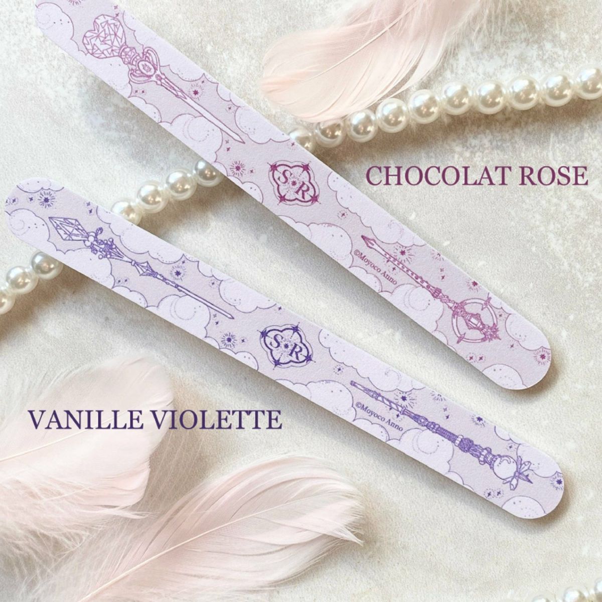 ショコラローズのネイルポリッシュにはショコラ&シナモンのスティック柄、バニラバイオレットのネイルポリッシュにはバニラ&シルヴィアのスティック柄のデザインのネイルファイルを一緒にお届けします。