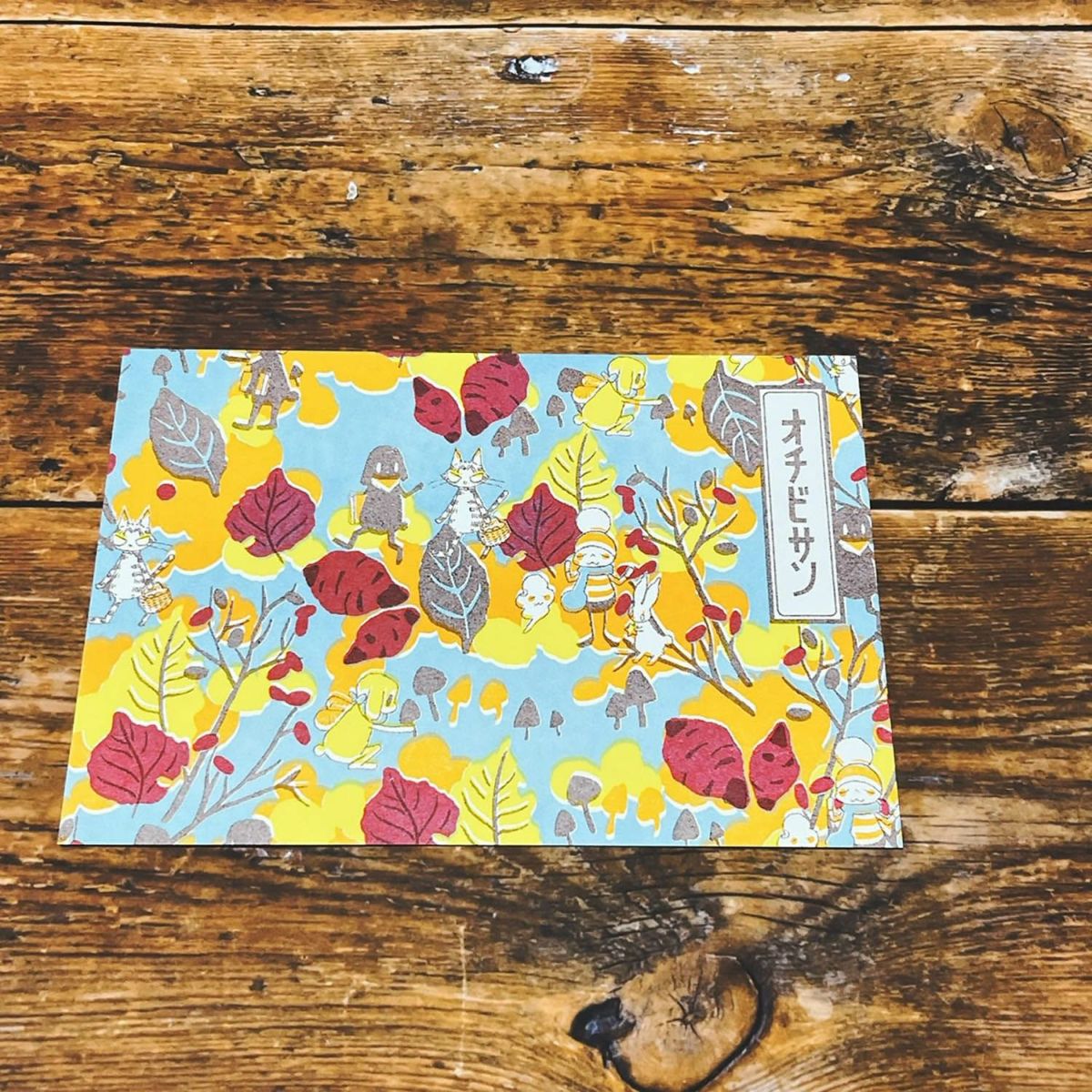 落ち葉やサツマイモやキノコ、秋のモチーフがたっぷりの温かみのあるデザインです。
