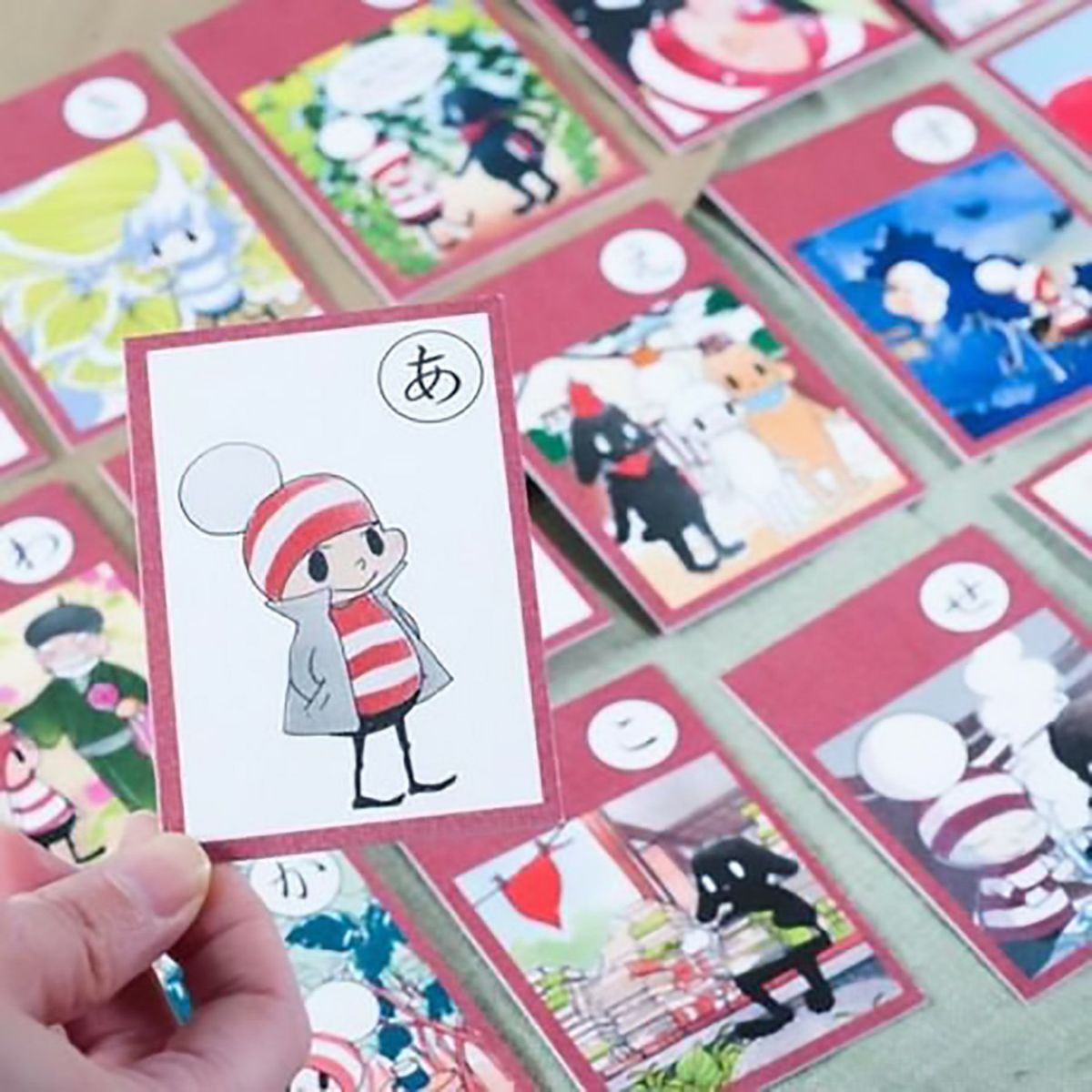 オチビサンと楽しむ四季折々の豆粒町の毎日が、たくさん詰まったカルタです。