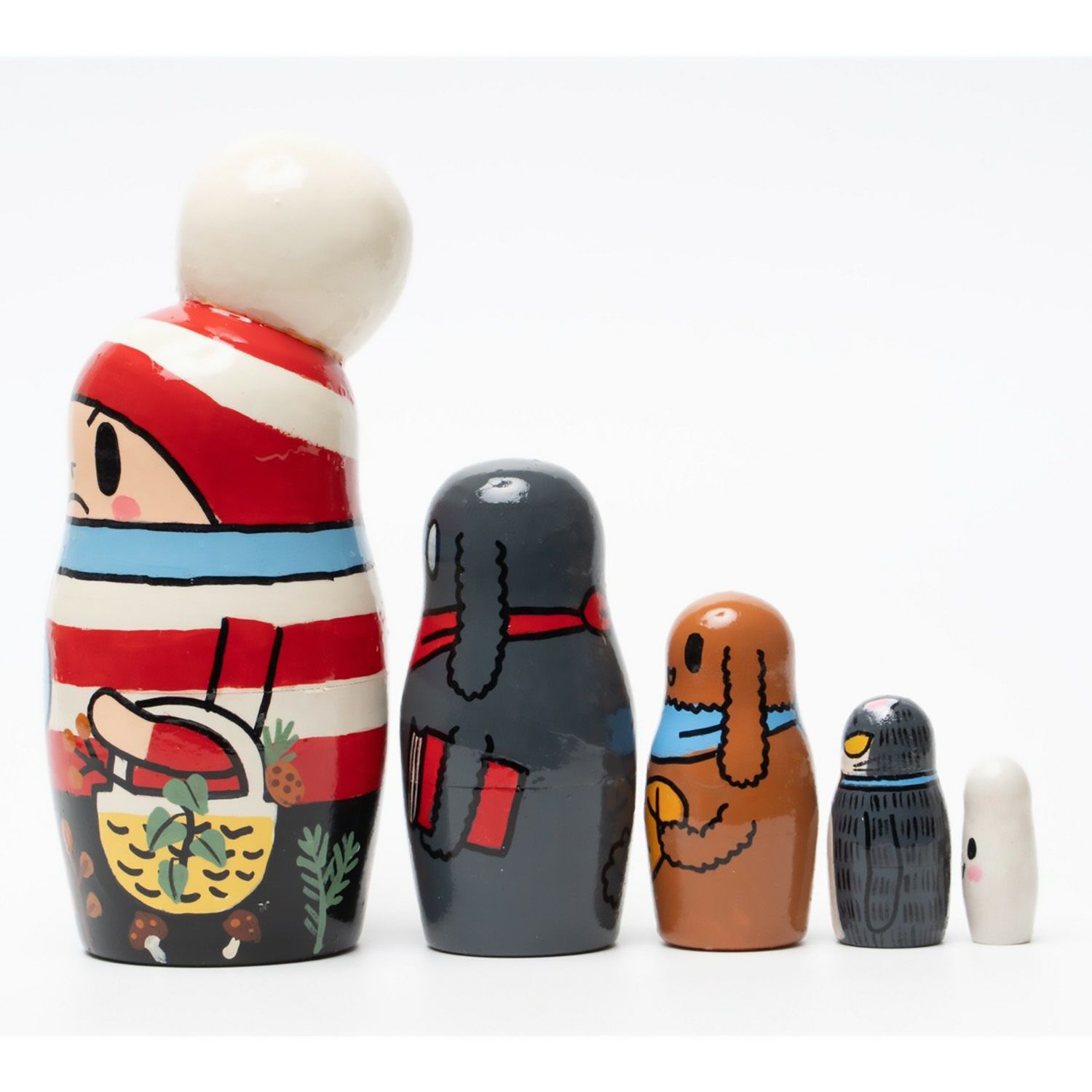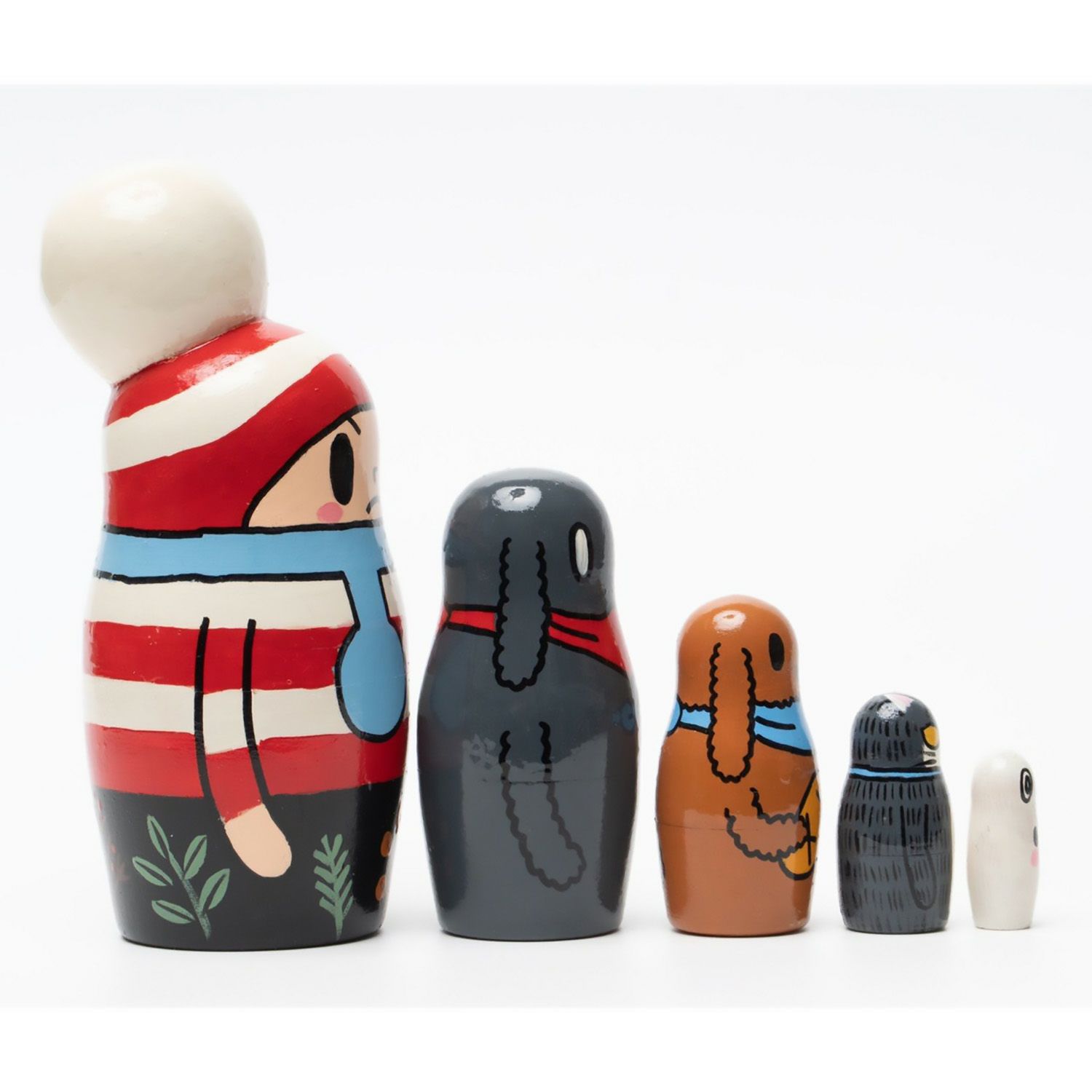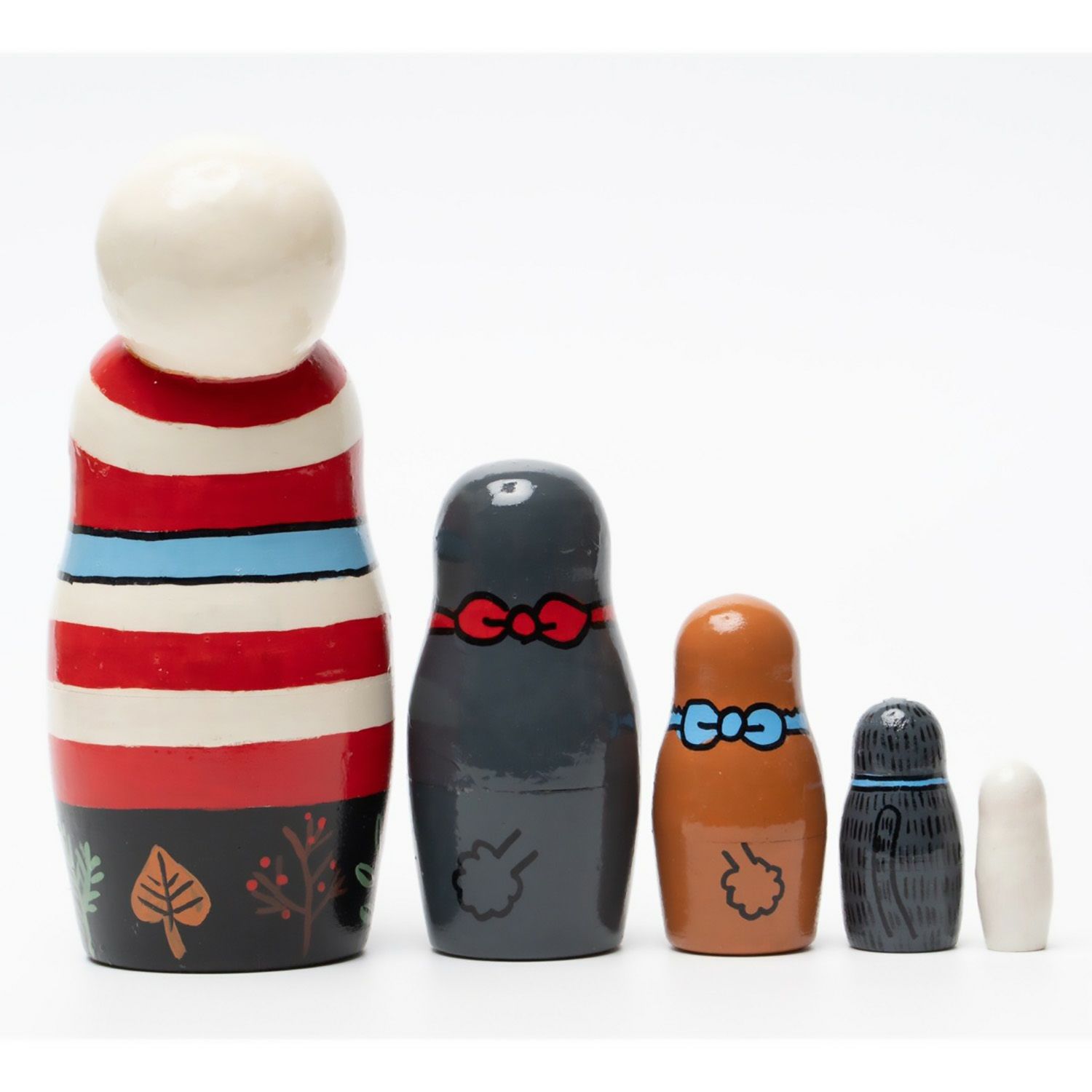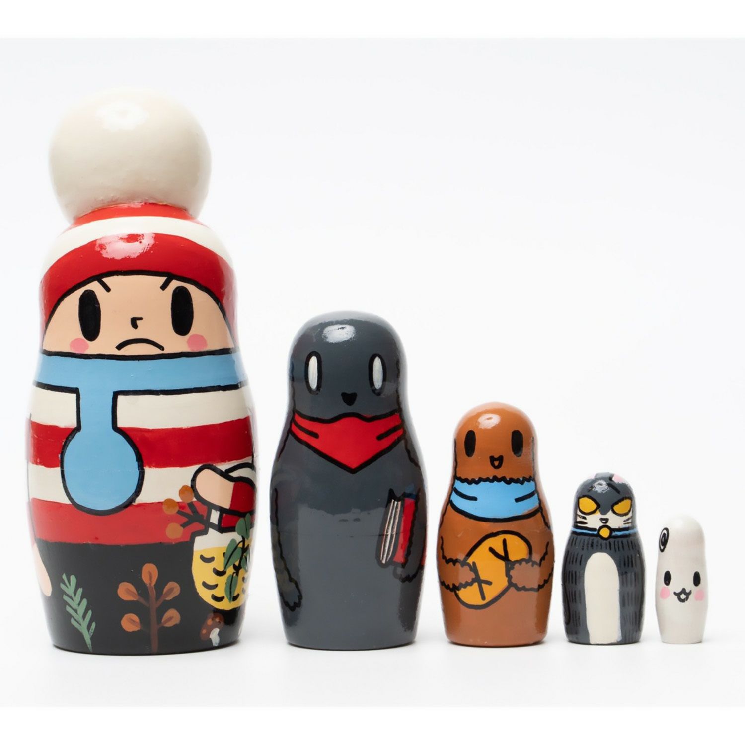 オチビサンマトリョーシカでは、オチビサン、ナゼニ、パンくい、ジャック、シロッポイの順に、合計5体のお人形のセットです。