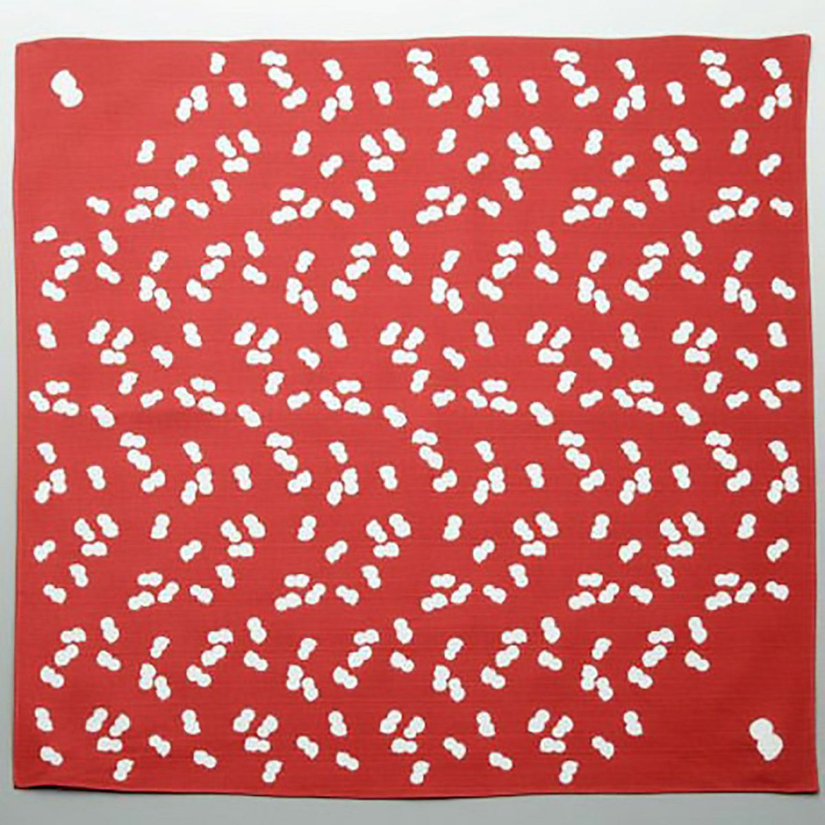 風呂敷のデザインとしてアレンジするにあたり、結んだときにひょっこり顔を出す“はしっこ”が、よりかわいらしく見えるよう、ふたつの角に大きめの「オチビ玉」を入れました。全体を眺めると、たくさんの花びらが流れているようにも見え、ふと気づけば天の川にも見えて、動きのある絵柄となっています。そしてなによりこの、パッと明るくかわいいオチビカラー! 赤い色を身のまわりに置くと、なんだか元気がわいてきます。