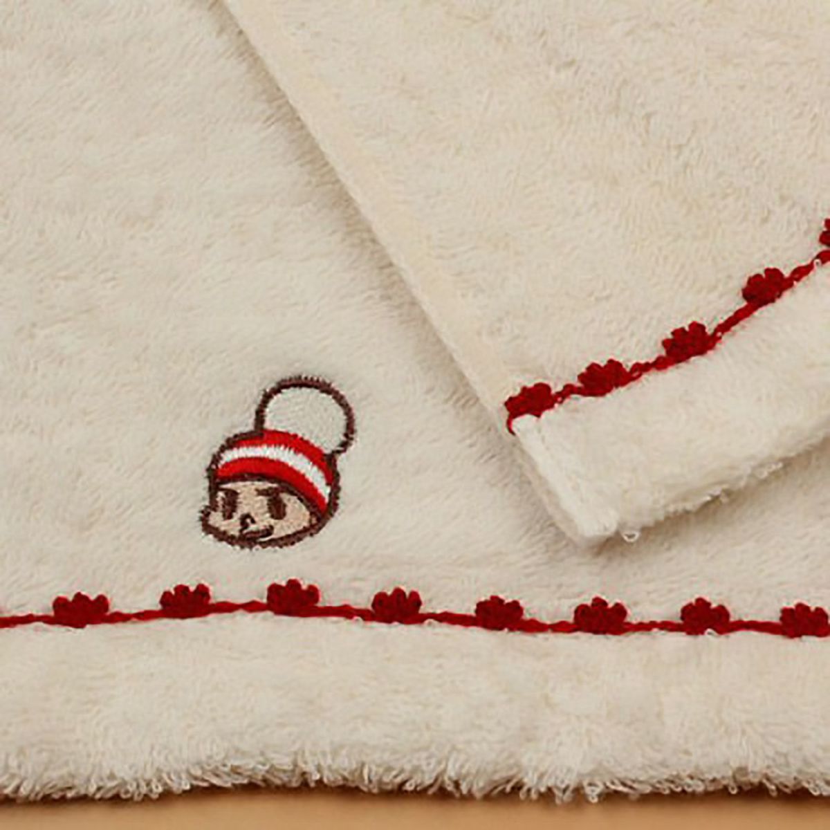 ●素材…タオル部分:オーガニックコットン100%、キャラクター刺繍部分:レーヨン糸使用、ピコット(両端の飾り)部分:ポリエステル糸使用