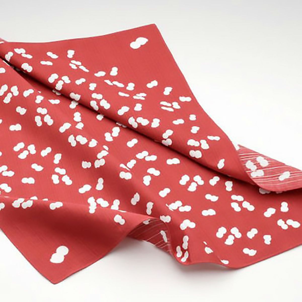 風呂敷のデザインとしてアレンジするにあたり、結んだときにひょっこり顔を出す“はしっこ”が、よりかわいらしく見えるよう、ふたつの角に大きめの「オチビ玉」を入れました。全体を眺めると、たくさんの花びらが流れているようにも見え、ふと気づけば天の川にも見えて、動きのある絵柄となっています。そしてなによりこの、パッと明るくかわいいオチビカラー! 赤い色を身のまわりに置くと、なんだか元気がわいてきます。