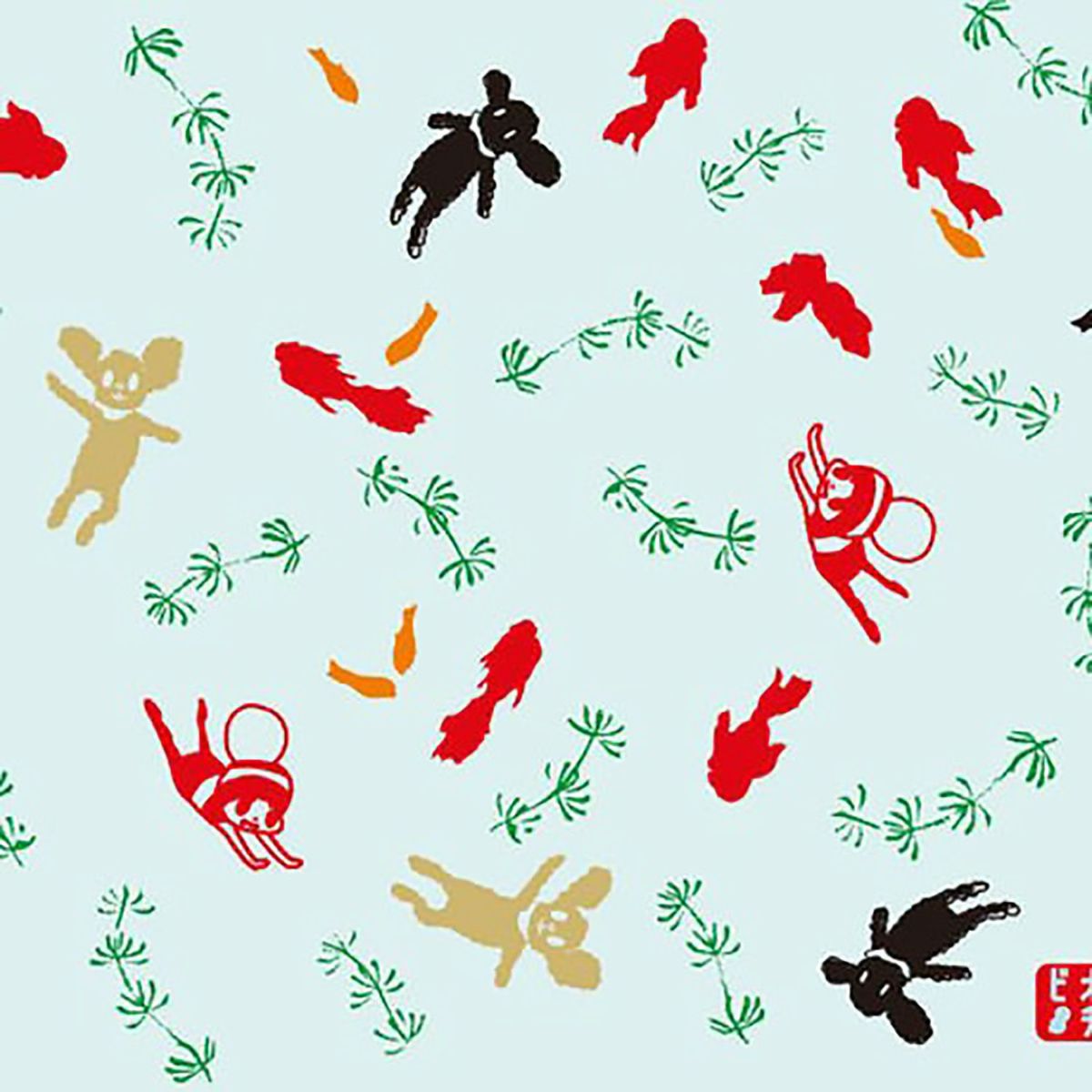 こちらのてぬぐいは、伝統の梨園染め(注染)をてがける、東京日本橋・戸田屋商店の職人さんが手染めで仕上げたものです。金魚の赤のしっとりとした雰囲気に合わせるため、織りのきめが細かい特岡生地が使われました。特岡は浴衣にも使われる木綿の生地で、肌ざわりがとてもしなやかなのが特長です。洗うほどにしなやかさは増し、ふんわりと、よく吸水するようになります。