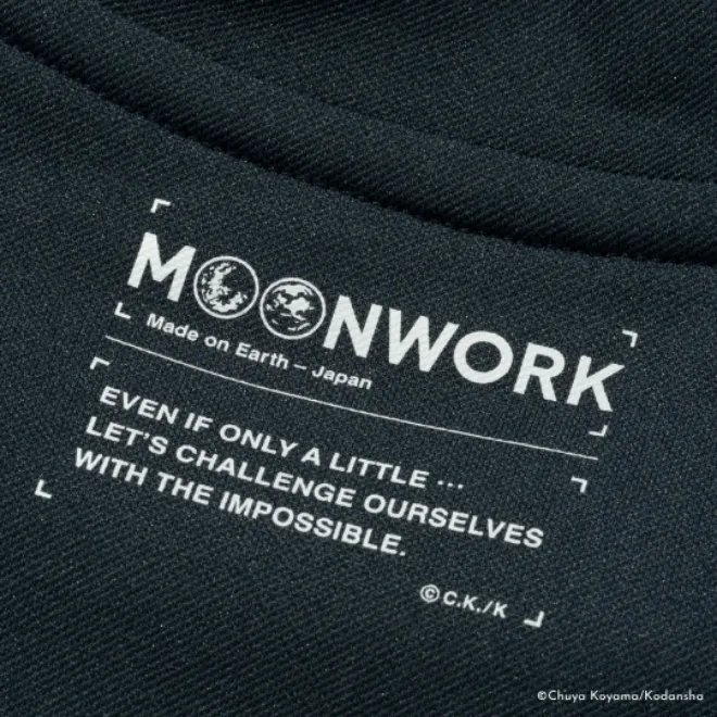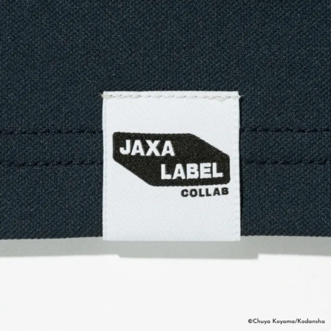 襟裏には、月と地球の上で握手を交わすMOONWORKシリーズのロゴマークが入ります。左袖先には、JAXAとのコラボレーションをベースに生まれた商品に付与が許可される「JAXA