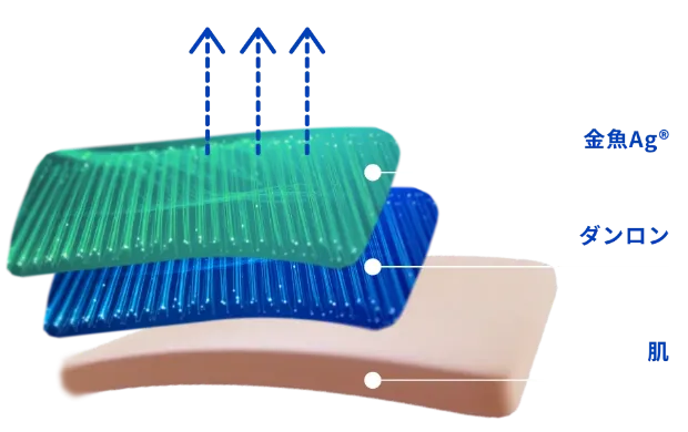 ダンロン®の使用肌側に使用しているダンロン®という素材は、保水をしないポリ塩化ビニル繊維を使用したもの。汗や湿気を溜め込まず、外にどんどん放出します。